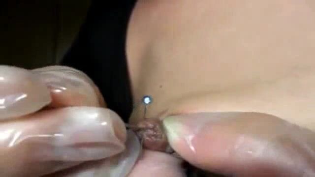 This woman is a real masochist and she inserts needles in her nipples. She has to do it very often so she has to study all the needle play technique in detail. This is just a small episode of many hours of video.