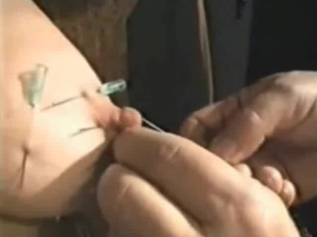 Pain slut gets needles in her tits. Clothespins squeezed and pulled her nipples very much. Master pierces her skin with needles. There are dozen of sharp needles in her flesh but she moans and begs for more. Then she got long needle in her tongue.