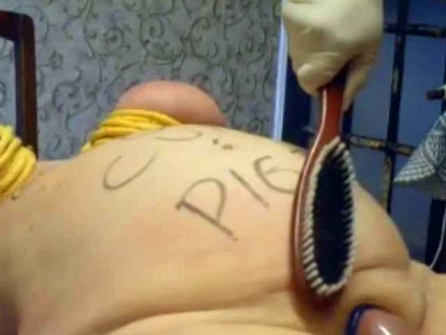 Fatty wife is humiliated and her big boobs wrapped with rope. There is a vacuum pump on her pussy. Her husband spanks her tits and body with clothes brush