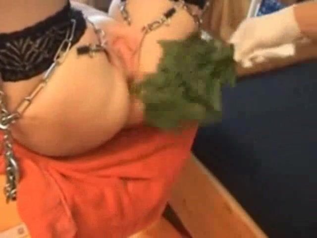 Collared slave swinging on a sex swing while her Master whips her pussy with stinging nettles. Then he pushes the nettles in her asshole and fucks her ass burning his cock too