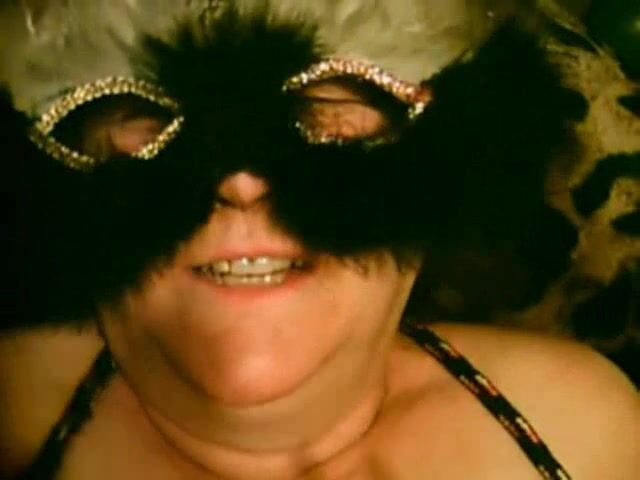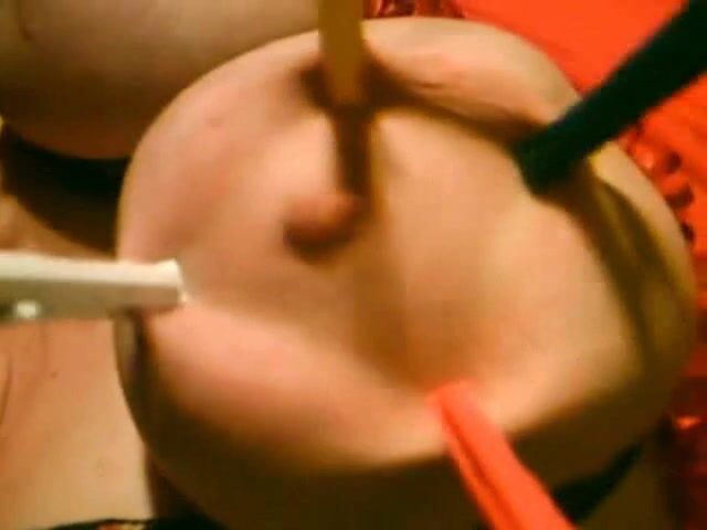 You can see a woman in a mask showing her huge bound tits with clothespins attached to them