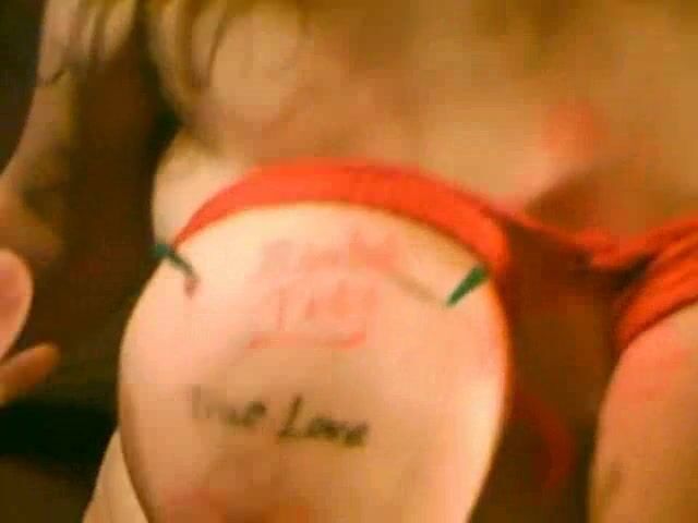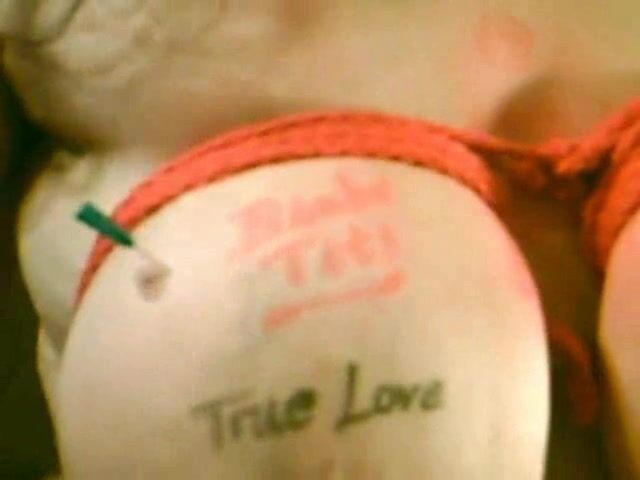 Humiliated freak with tits tied up and covered with clothespins and strange inscription gets needles in her boobs