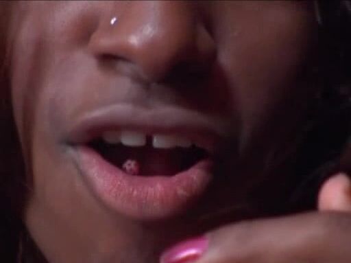Black busty tranny shows her pink tongue