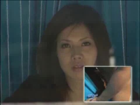 Asian girl in a storefront window while being fucked from behind a curtain.