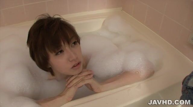 Short-haired hottie Akina Hara and her gentle sucking mouth in the bathroom