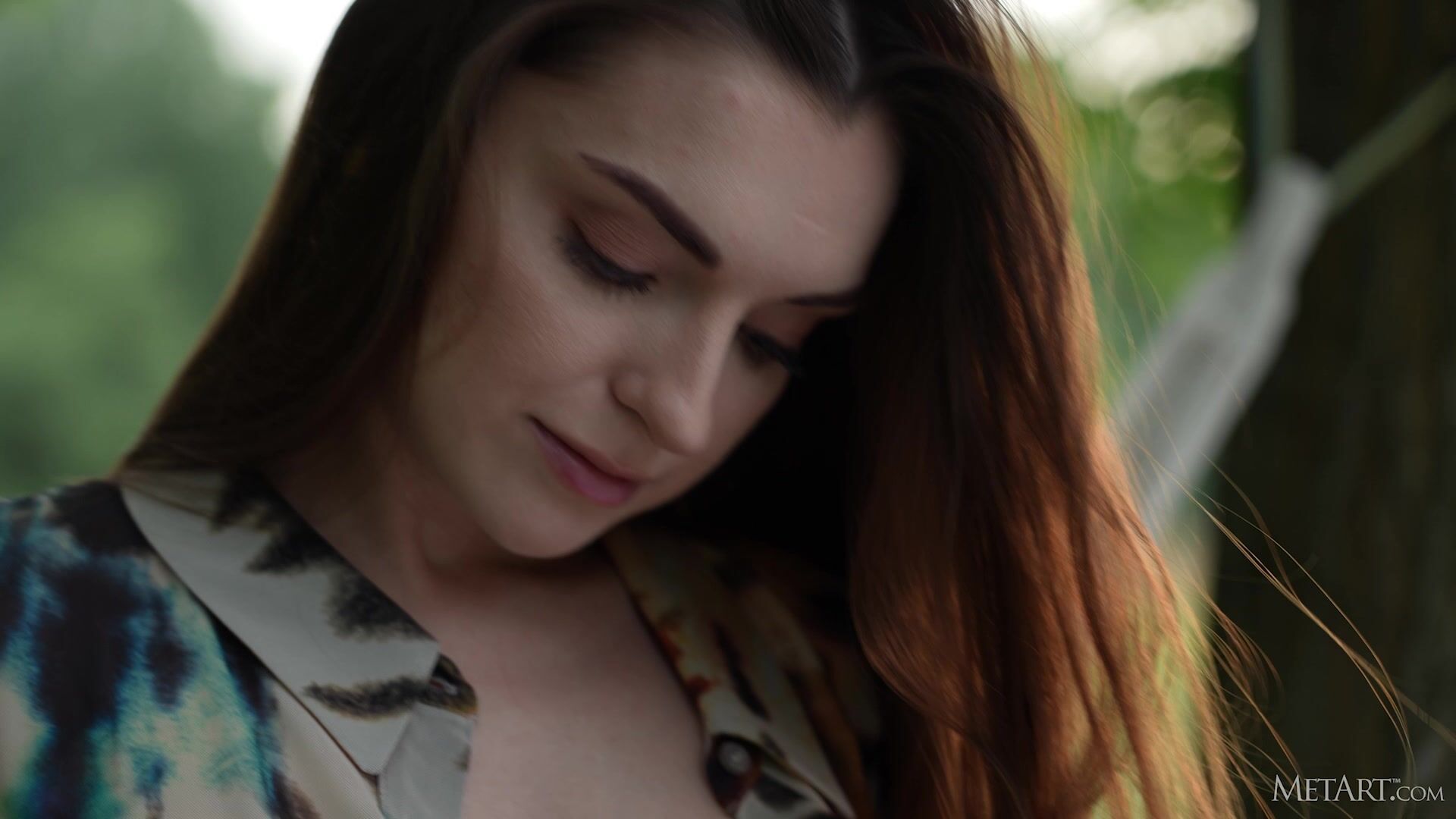 Stunning brunette Monika May waits for you under a tree in the meadow, running her hands over her body sensuously. She slides her panties down over her sexy ass, unbuttons her shirt and caresses her lovely breasts. Rocking in a hammock, the captivating beauty strokes the soft hair that crowns her pussy, her smile flirtatious and her dark eyes full of passion.
