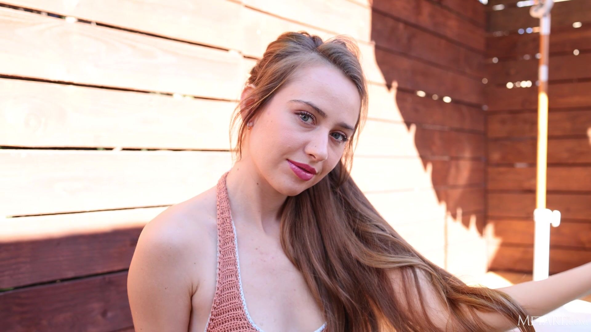 Stunning blonde Amber Aura has fun at the pool, paddling in the water in her cute crocheted bikini. The vivacious American beauty will charm you with her sweet smile as she unties her bikini top and caresses her perky breasts, then tugs at the strings that hold her panties together and lets them drop. She parts her thighs to reveal the sprinkling of hair that fringes her pretty pussy, her big blue eyes sparkling flirtatiously.