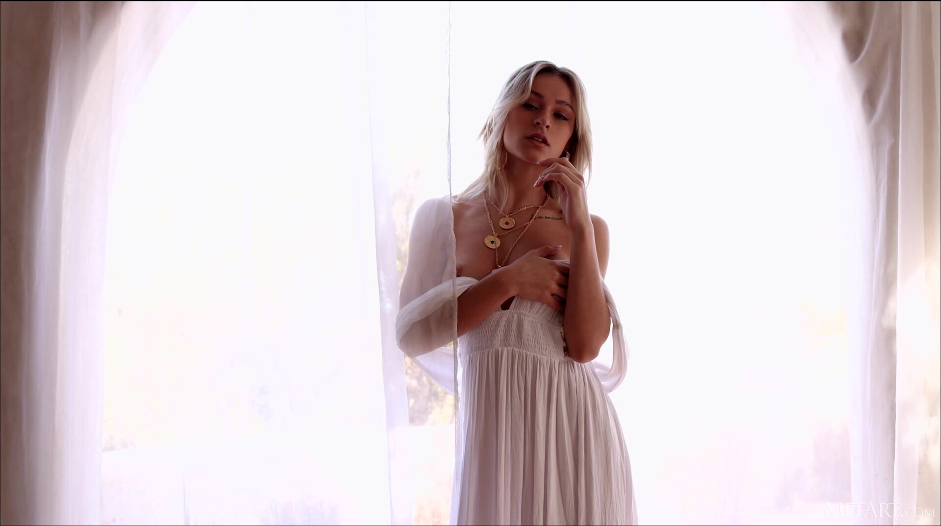 Stunning blonde Tavia lifts her long white dress for a tempting upskirt view of her bare pussy and sexy ass. The American beauty smiles flirtatiously as she slips her outfit from her shoulders and lets it fall. Her blue eyes are bright with passion as she moves seductively, inviting you to appreciate every detail of her gorgeous naked body.