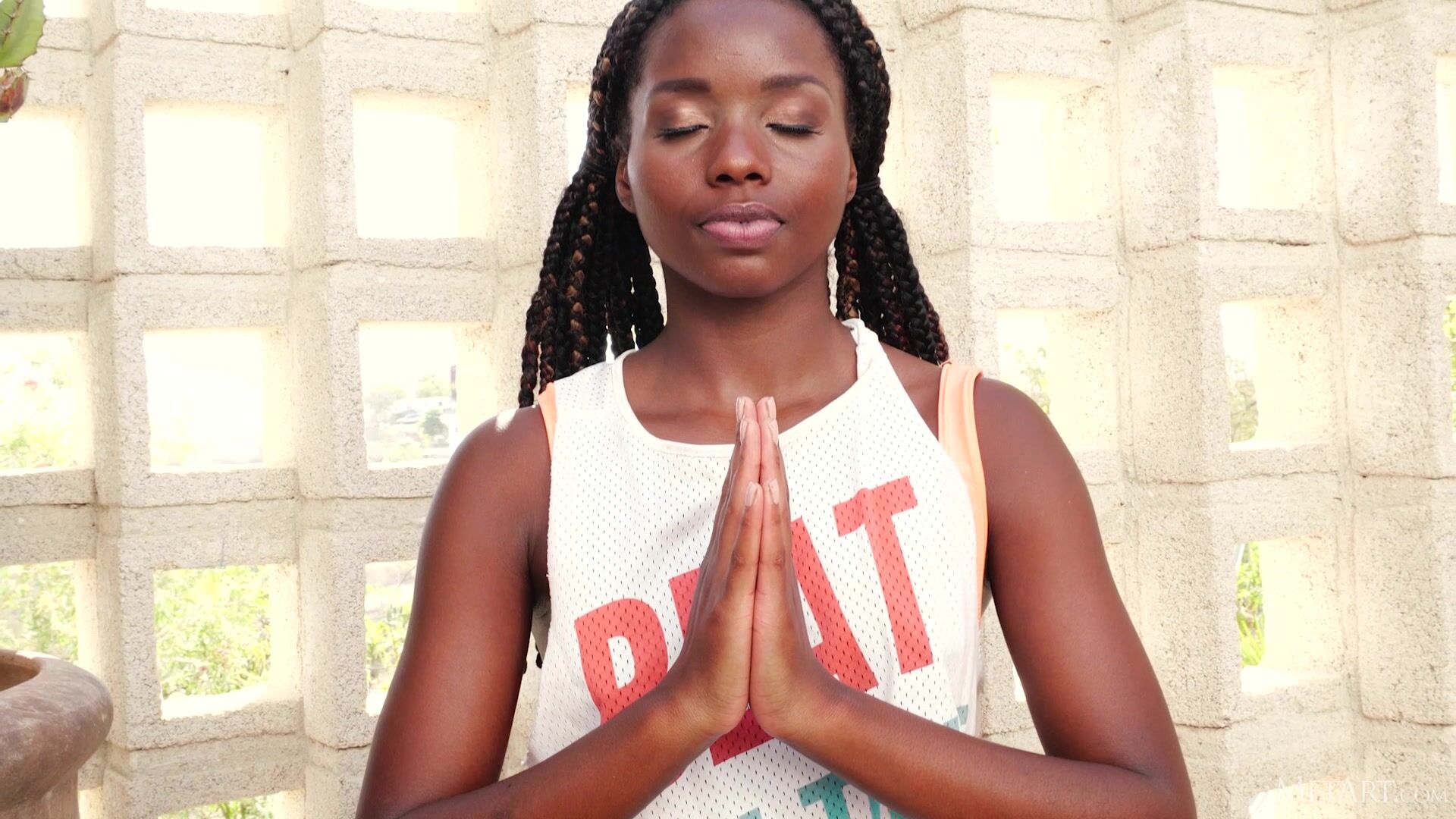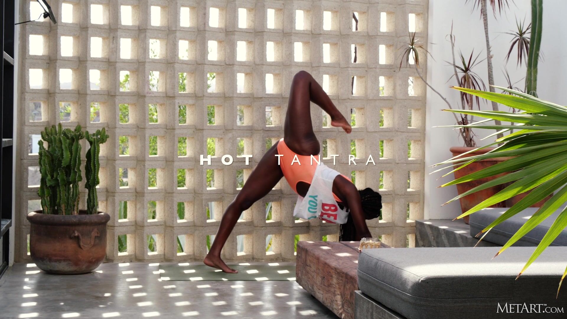 Sexy American sweetheart Dakota Simone invites you to join her for a hot yoga session in the sunshine. The curvaceous Black beauty starts her bends and stretches, her supple body moving through each position with ease. She smiles flirtatiously as she slides her leotard from her shoulders, exposing perky breasts that glisten with perspiration as she continues her workout. Getting naked, she flaunts her shaved pussy and gorgeous bubble butt in the most provocative positions, in a sensational display of flexible femininity.