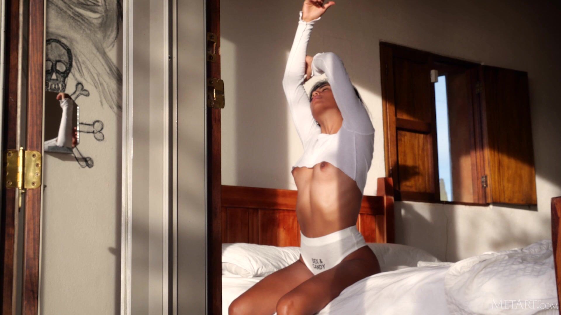 Stunning Costa Rican beauty Katherinne is lying on her bed, bathed in light from the floor-to-ceiling windows. The sultry Latina sweetheart rolls over, her white thong panties stretched tight between the cheeks of her sexy ass. She stretches languidly, pulling off her t-shirt to bare her lovely breasts and stroking her puffy nipples lovingly. Peeling off her panties in a slow tease, she spreads her tanned thighs, her neatly trimmed bush drawing the eye down to her dark, plump-lipped pussy. She gazes out at the desert view, then sits in the sunshine, posing provocatively – her movements sensual, her body flawless. The charming selfie shots reveal a more playful side of her personality.