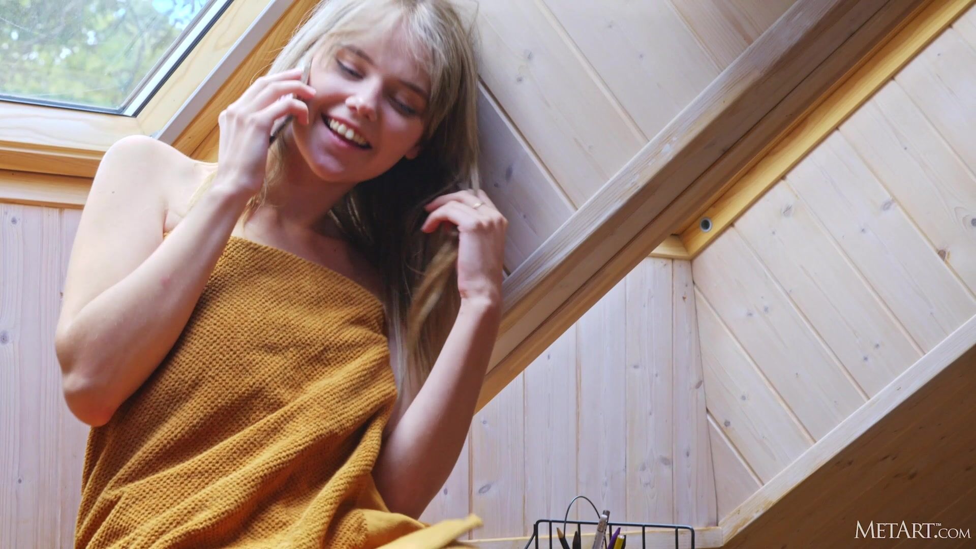 Cute Marciana is wrapped in a towel, giggling vivaciously as she chats on her phone. Hanging up the call, the blue-eyed babe stretches out on the bed, her gorgeous big breasts jiggling enticingly as she moves. Thighs spread for a closer look at her shaved pussy, she goes face down ass up, grabbing her curvy booty playfully. She’s simply adorable as she shares the naked fun with you.
