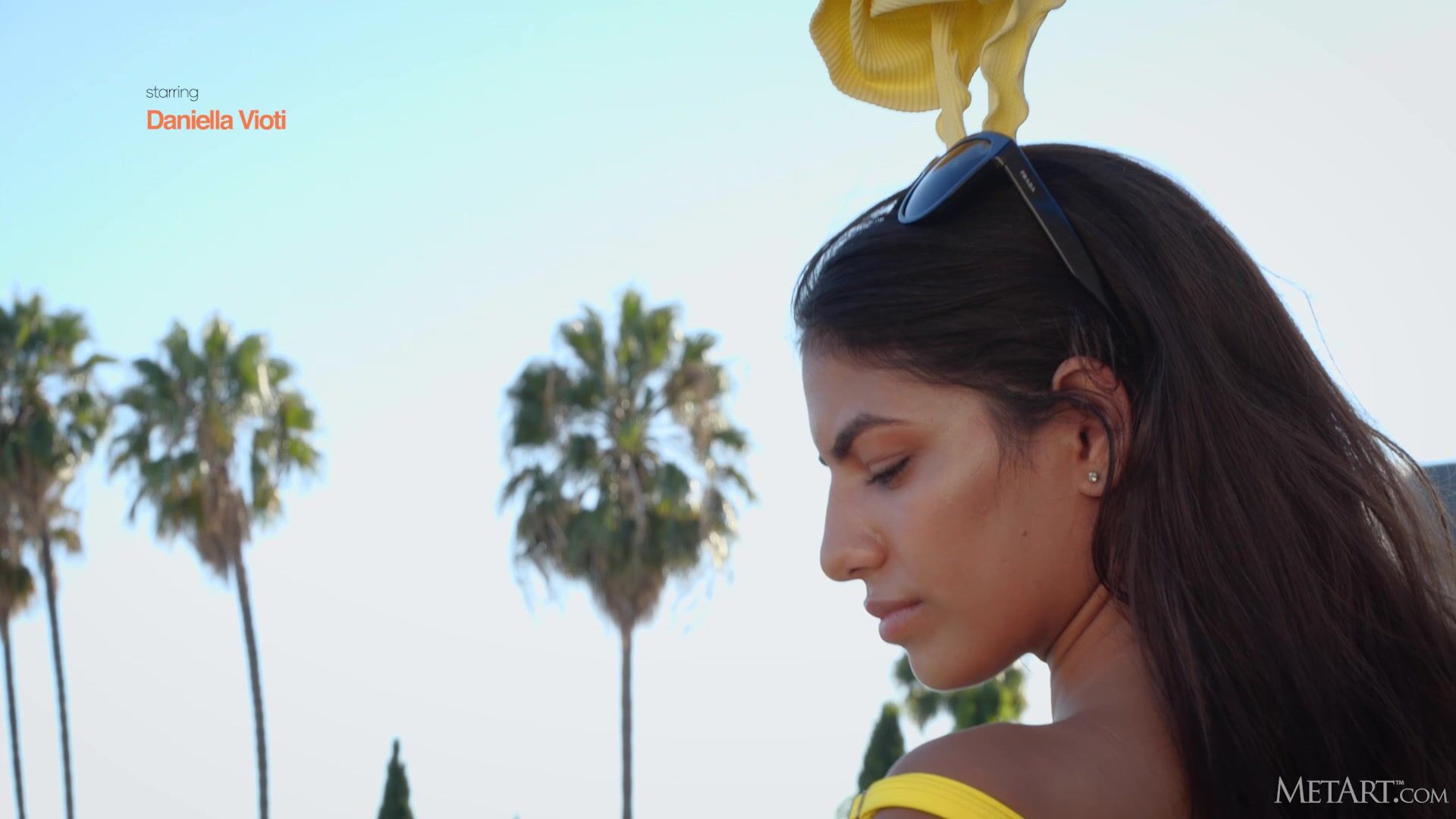 Voluptuous Middle Eastern beauty Daniella Vioti is hanging out laundry on a breezy day. Stripping down to her bright yellow bikini, she moves sensuously, wiggling her sexy ass. She sits on the balcony, not caring who might see as she takes off her bikini top, baring gorgeous breasts that jiggle enticingly. Pulling down her panties, she bends over for a delicious rear view of her pussy, then spreads her thighs wide for a lingering look at her luscious naked body.