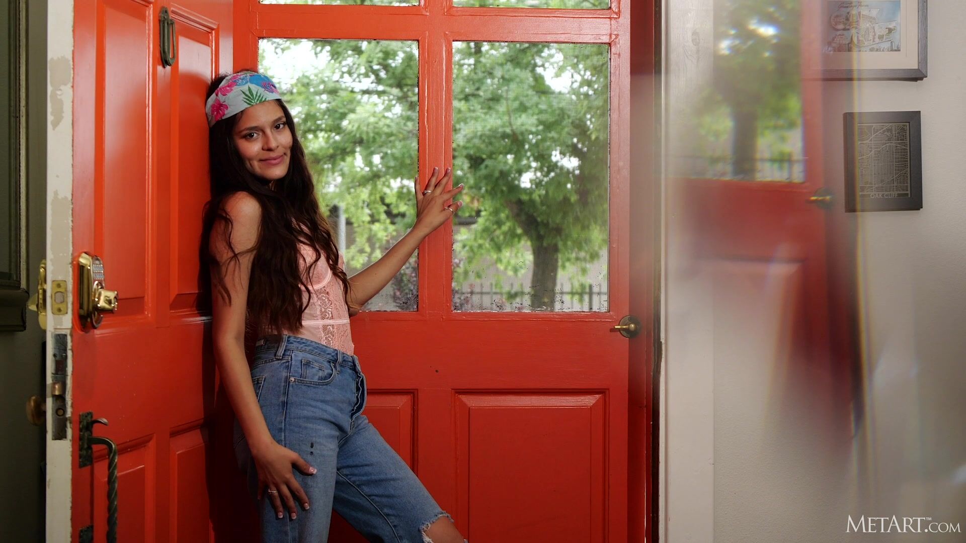 Gorgeous brunette Kristina Faith checks out her new home, her body language sweetly sensual. The vivacious Hispanic beauty admires her reflection in the mirror as she slides the straps of her lace corset from her shoulders to expose her perky breasts, her dark nipples stiff with anticipation. She eases her jeans down over her sexy bubble butt, then wriggles out of her lingerie, bending over for an enticing rear view of her shaved pussy. Relaxing with long legs spread wide, she invites you to enjoy every inch of her hot body.
