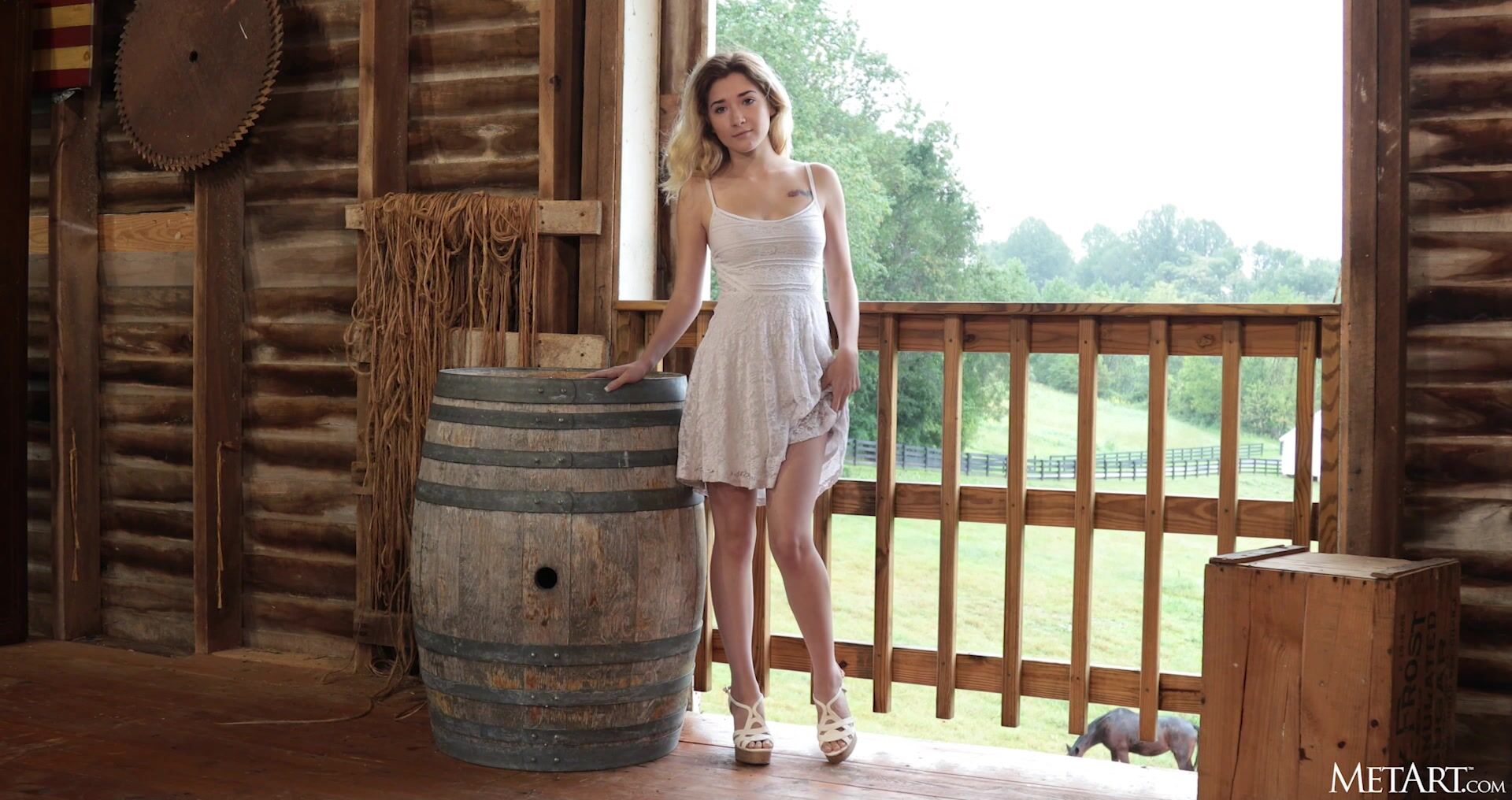 Sexy farm girl Allie Reed flips up her summer dress for a teasing flash of her cute ass and bare pussy. The American cutie lets the dress slip down to show off her beautiful breasts, standing naked to gaze out over the lush green fields. Hands roaming south, she strokes her silky thighs and peachy cheeks. She smiles as the breeze blows through her blonde hair, squeezing her soft breasts, enjoying her own tender touch.