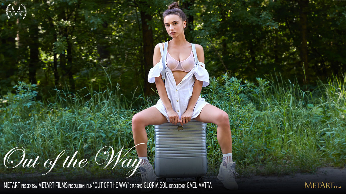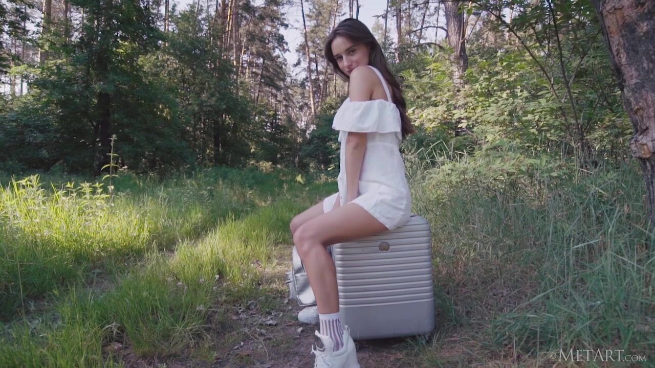 Stunning Gloria Sol is on her way to a countryside retreat, wheeling her suitcase along an overgrown path. The irresistible brunette stops in a woodland clearing to enjoy the sunshine, unbuttoning her summer dress to reveal sexy lingerie so transparent it barely hides her big, beautiful breasts and shaved pussy. Straddling her case, she takes off her bra, her gorgeous breasts bouncing free. She takes off her panties too, enjoying her uninhibited nakedness, a vision of feminine perfection.