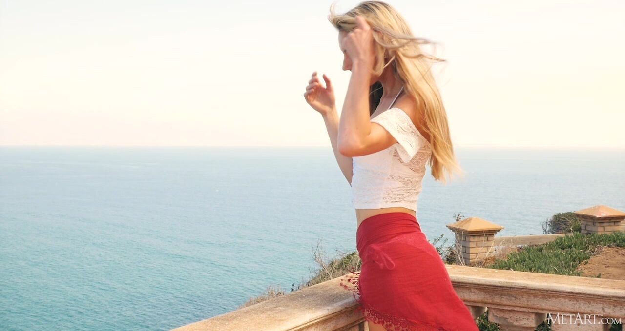 Luscious Jennifer Love exudes sensuality as the wind blows through her long blonde hair, and lifts her wrap to expose the curvy cheeks of her gorgeous ass. As the awe-inspiring Australian looks out to sea, she unties her bikini top to expose her pert breasts to the sun's stimulating rays, then removes her bikini briefs to reveal her pussy with its perfectly trimmed bush. Full of energy, she cavorts expressively, at one with her nakedness, wearing a truly inviting smile.