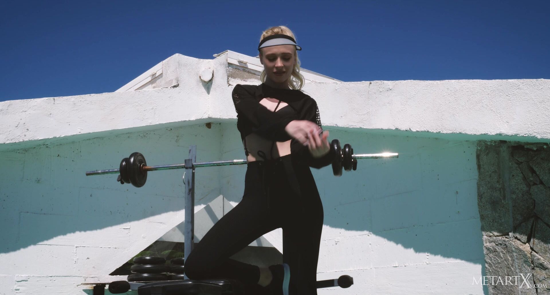 Gorgeous blonde Riley Anne is working out in the sunshine, bending and stretching her sexy body. Feeling the heat, she lifts her crop top and tugs at her bra, exposing her beautiful big breasts, which bounce hypnotically as she jumps rope. She pulls down her tight yoga pants, revealing the soft hair that adorns her mound of Venus, and spins around to flaunt her peachy ass. Turned on by her naughty exhibitionism, the American cutie masturbates in the spa, teasing her hard nipples and thrusting her fingers into her pussy, giving herself an intense orgasm before showering off.