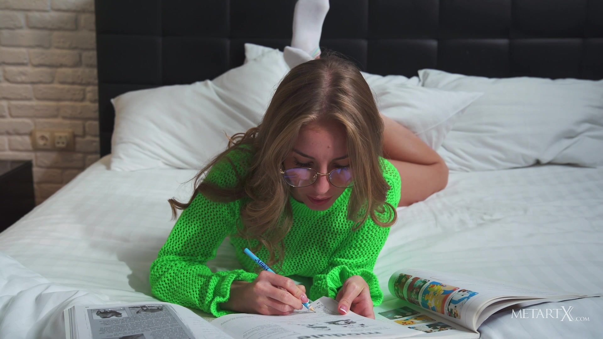 Gorgeous blonde Bjorg Larson is poring over her textbooks, as studious as she is sexy in her wire-framed glasses. She finds herself getting distracted by thoughts of a more sensual nature, and stretches out on the bed to explore her lovely body with wandering hands. Tugging her lacy white panties aside, she starts to masturbate, moaning softly as she rubs her sensitive clit and puffy nipples. She rocks her hips to ride the intense sensations as she thrusts her fingers into her wet pussy, grabbing her curvy ass cheeks and big breasts amorously. Going face down ass up, then lying back against the pillows, the voluptuous beauty drives herself to a powerful orgasm.