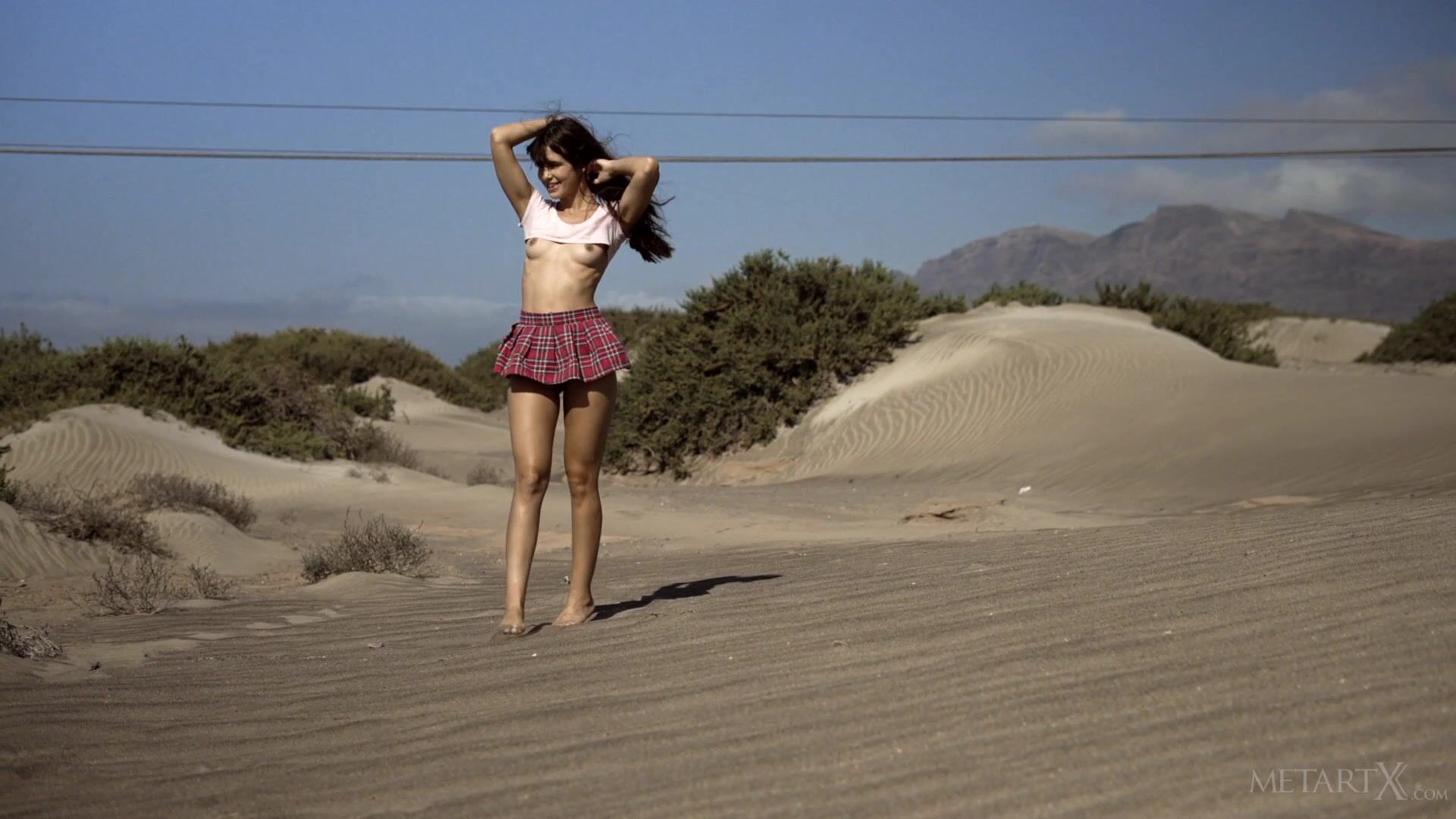Gorgeous Leni Doll strolls among the sand dunes, her plaid skirt so short it doesn’t even cover her perfect ass. The Spanish beauty flips it up to flash her shaved pussy and fondles her perky breasts as the wind whips her long brunette hair. Going indoors, her hands roam over her sexy body, her arousal growing as she spreads her succulent pussy lips and dips her fingers into her wetness. She moans with pleasure as she strums her clit to intensify the stimulating sensations, going face down ass up to masturbate frantically, until she’s overwhelmed by a powerful orgasm.