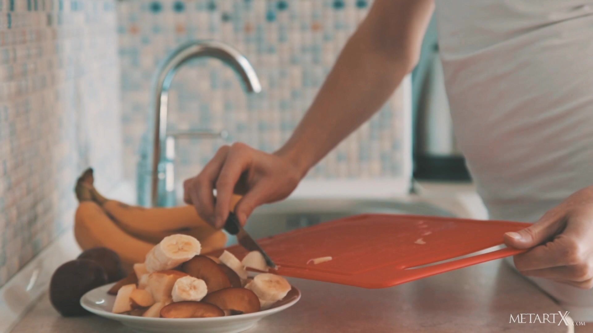 Sexy redhead Maria Rubio is in the kitchen, wearing a short white dress that barely covers her sexy ass. She peels a banana and takes a bite, then finishes preparing her fruit salad. Pulling up her dress, she slips her panties down, revealing the neat line of hair that leads the way to her hot pussy. She sits with thighs spread wide as she starts to stroke it, fingers moving in rapid circles on her clit as she squeezes her beautiful breasts. Thrusting a finger into her tight slot, she fucks herself hard and deep, turning onto her knees to frig herself from behind until she orgasms with a loud moan of ecstasy.