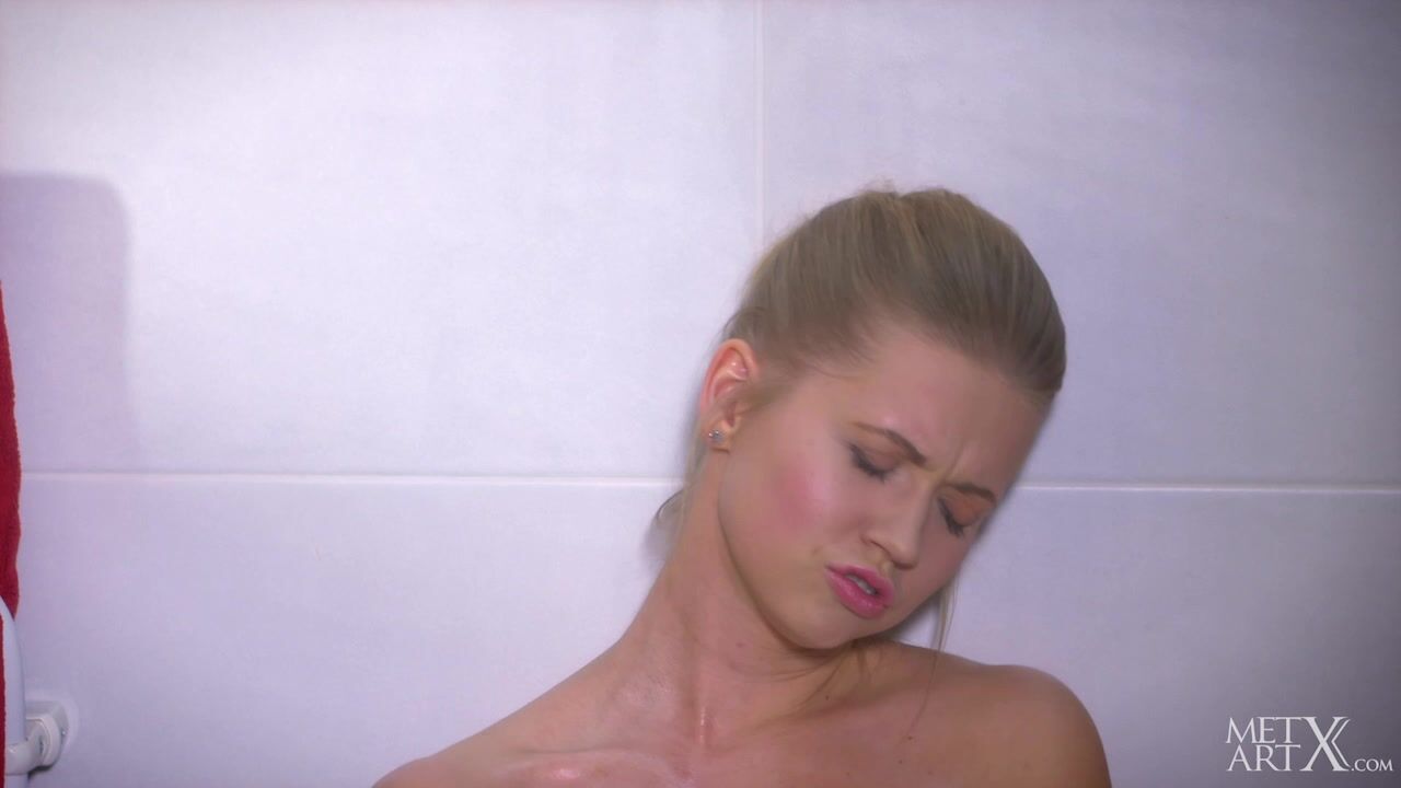 Cute blonde Violette Pink runs her hands over her beautiful body, so seductive in sexy lingerie. In front of the bathroom mirror, she takes off her bra to reveal her lovely small breasts, then slips off her panties, shaved pussy and firm round ass bared. She drizzles oil over her silky skin, massaging it in, stroking her fingers along the slippery groove between her plump pussy lips. She pushes them right into her tight hole, fucking herself faster, gasping with arousal. Squatting down, she rides her fingers, then lies on the tiled floor to masturbate to an intense orgasm.