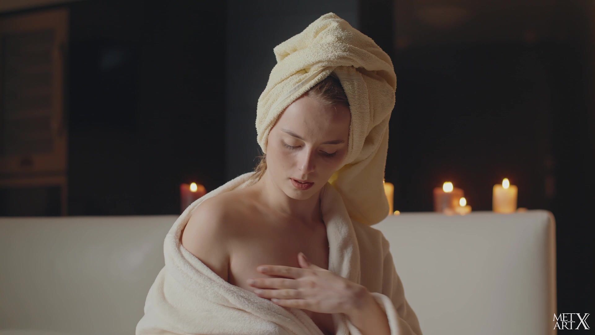 Sexy blonde Jillean is taking a shower, water streaming over her beautiful breasts. Wrapped in a cozy robe, she runs her hands up her silky thighs, then pours oil over her jiggling boobs and massages them lovingly. Lying back on her bed, she lets the robe fall open as she slides a hand between her thighs to stroke her shaved pussy, making it glisten. Fingers circling over her clit, the horny sweetheart masturbates sensuously, immersed in her own sensual pleasure. She goes face down, gorgeous ass up as she fingerbangs herself avidly, moaning with arousal, then moves onto her back as she diddles herself to a powerful orgasm.
