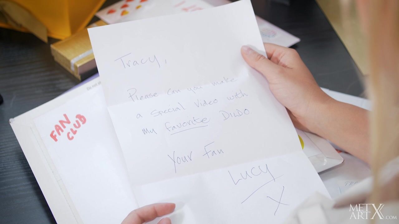 Sexy Tracy Lindsay has some devoted fans. The beautiful blonde receives a gift from one, Lucy, though the mail - a dildo. It comes with a request: <em>please make a video of yourself using it</em>. Tracy is only too happy to oblige, switching on her camera and undressing. Off comes her blouse and down go her shorts as the stunning beauty poses. She unhooks her bra, strokes her nipples stiff and rolls her panties down over her slim, tanned hips and thighs. Her camera is in the perfect position to capture the sight of her sweet ass, pussy pouting from between her thighs, as she bends down to step out of her underwear. Teasing with her new toy, she sucks on it, pushing it between her lips, then drapes one leg on her desk and rubs her clit. She turns herself on, enjoying her game. Rubbing her toy over her clit and slit, she eases it inside her hole and begins to masturbate with slow, purposeful rhythm.