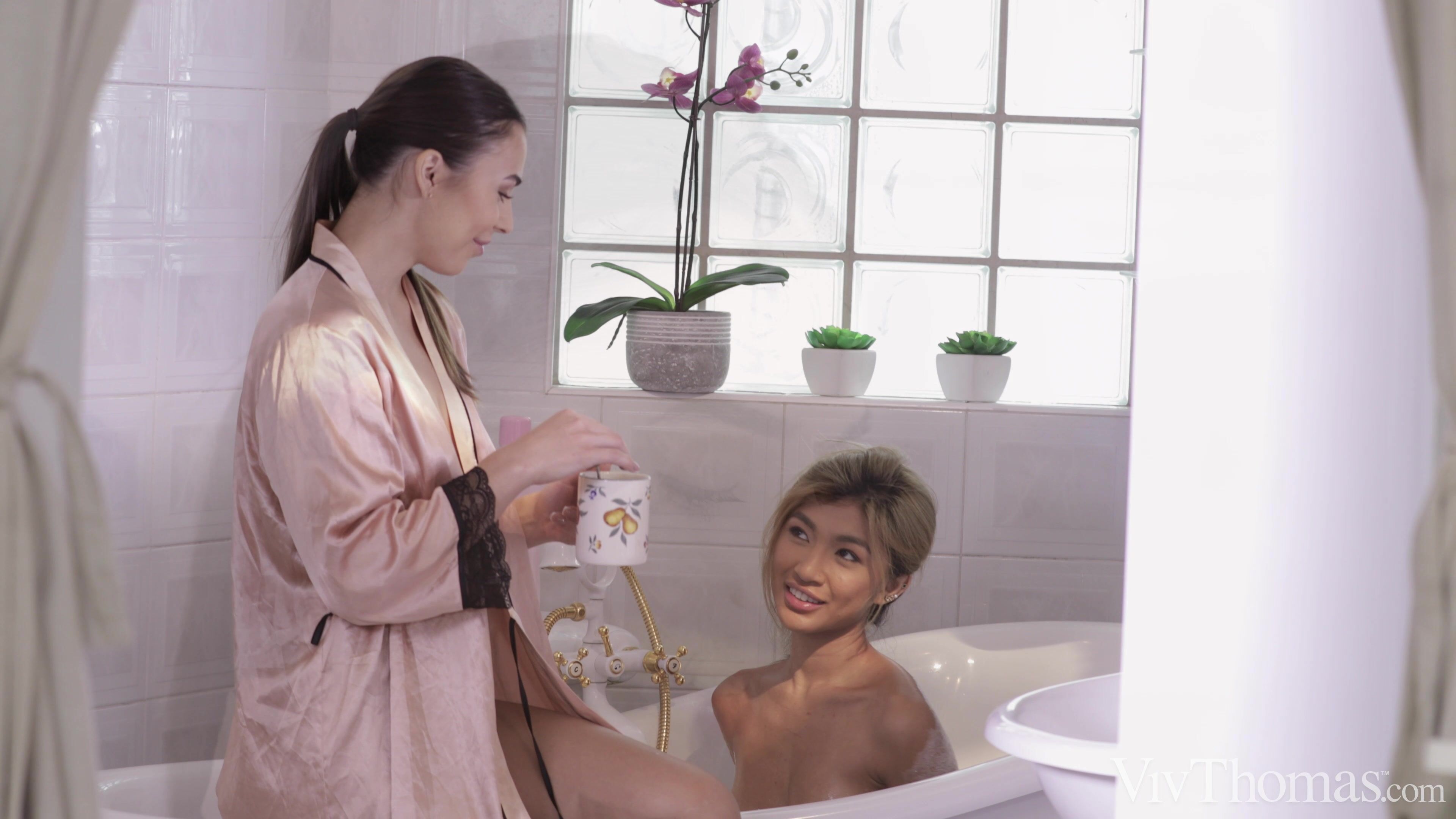 Cute Clara Trinity enjoys a hot bath on a snowy day, as Sandra Shine’s erotic lesbian movie “Naked Sexuality” begins. Her gorgeous girlfriend Milan Cheek helps her towel off, embracing her tenderly and leading her to the bed. Passionate kisses lead to voracious pussy eating as Milan moves between her Asian sweetheart’s slender thighs to lick her shaved pussy. Clara rolls over and Milan eats her from behind, tonguing her tight asshole and strumming her clit to drive her to an intense orgasm. Now Clara reciprocates avidly, fondling Milan’s puffy nipples and licking her to a powerful climax.