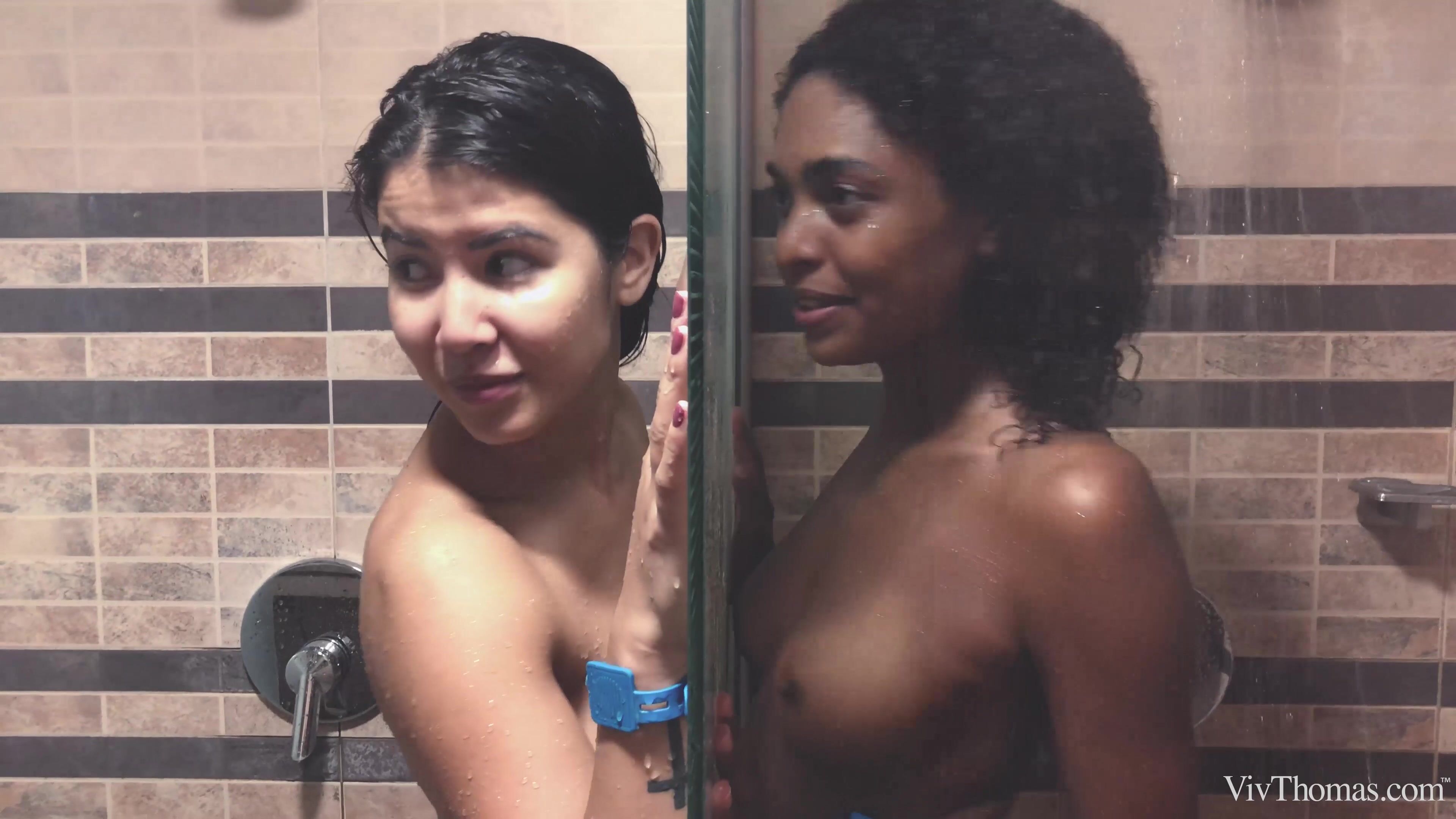 Sexy in their skintight swimsuits, cute Lady Dee and Luna Corazon spend a fun day at the public swimming pool, as episode four of Sandra Shine’s erotic movie series “Dripping Wet” begins. After their swim, the beautiful babes take a shower together, giggling at the risk of getting caught naked. In the locker room, ebony darling Luna massages moisturizer into Lady Dee’s shoulders and back. Lady Dee gets so aroused by Luna’s sensual touch that she pulls her close for a hungry kiss. Horny Luna sucks on Lady Dee’s erect nipples, then trails her sticky tongue down her firm body and along the slit of her shaved pussy, making her moan with pleasure. The cute brunette grinds on Luna’s tongue, turning around so Luna can kiss her silky smooth ass cheeks and rim her puckered hole as she fingers her juicy pussy. Such intense stimulation soon has Lady Dee howling through a powerful orgasm. She kisses Luna voraciously as she diddles her pussy, then kneels to eat her, lapping at her clit skillfully. Luna goes wild, gasping and squeezing her perfect breasts as Lady Dee uses her tongue and fingers to drive her to a noisy climax. The lesbian lovers kiss and giggle, seemingly having forgotten their passion has bubbled over in a public place.