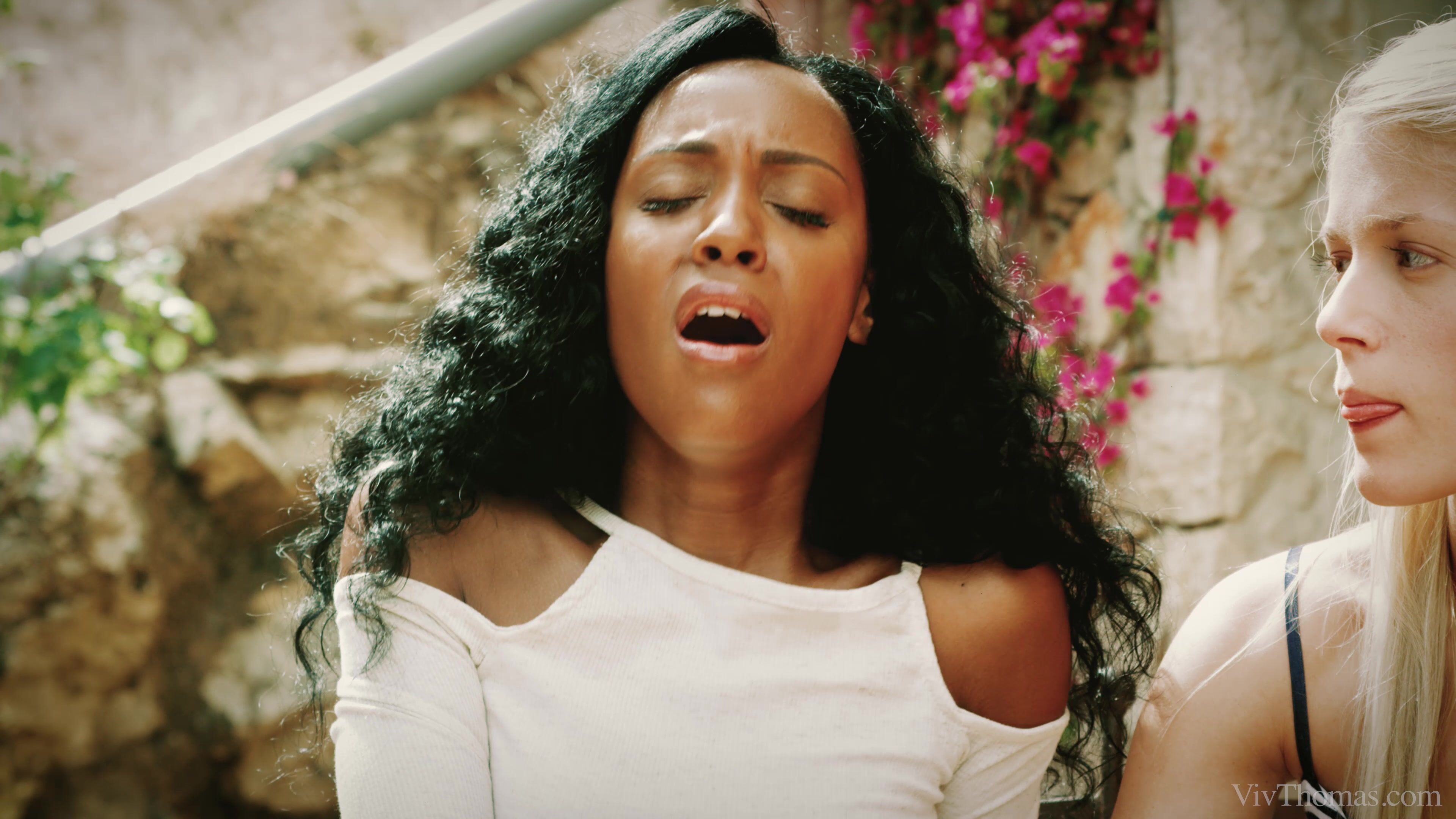 Ebony beauty Noe Milk looks and sounds irresistible as she reads aloud in Spanish. But her concentration is sorely tested by the huge vibrating wand that pretty blonde Sweet Cat is holding against her pussy. Noe gasps as Sweet Cat increases the vibrations, the sensations building until she is unable to continue reading and her orgasm overwhelms her. The girls undress, Noe sucking Sweet Cat’s stiff nipples and kissing her way down to her pussy, fingering and licking her until a climax wracks her slender body. Cat licks Noe’s puffy clit skilfully, thrusting a couple of fingers inside to stroke her to a rapid orgasm. Noe lies back so Cat can straddle her face and ride to another powerful climax.