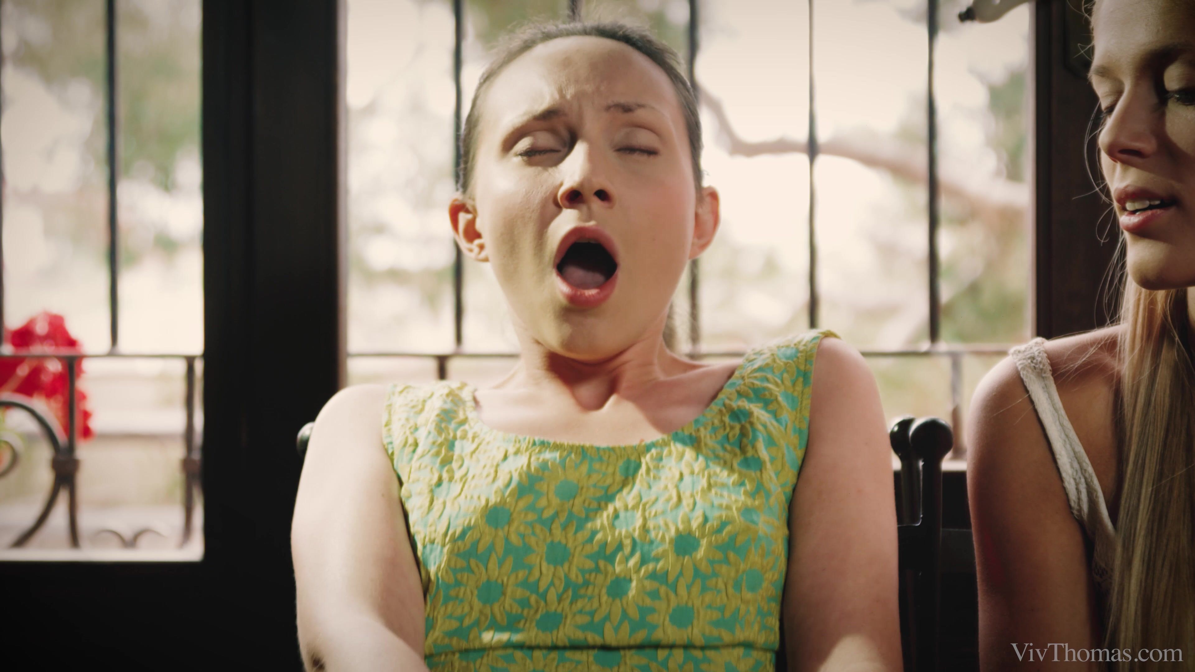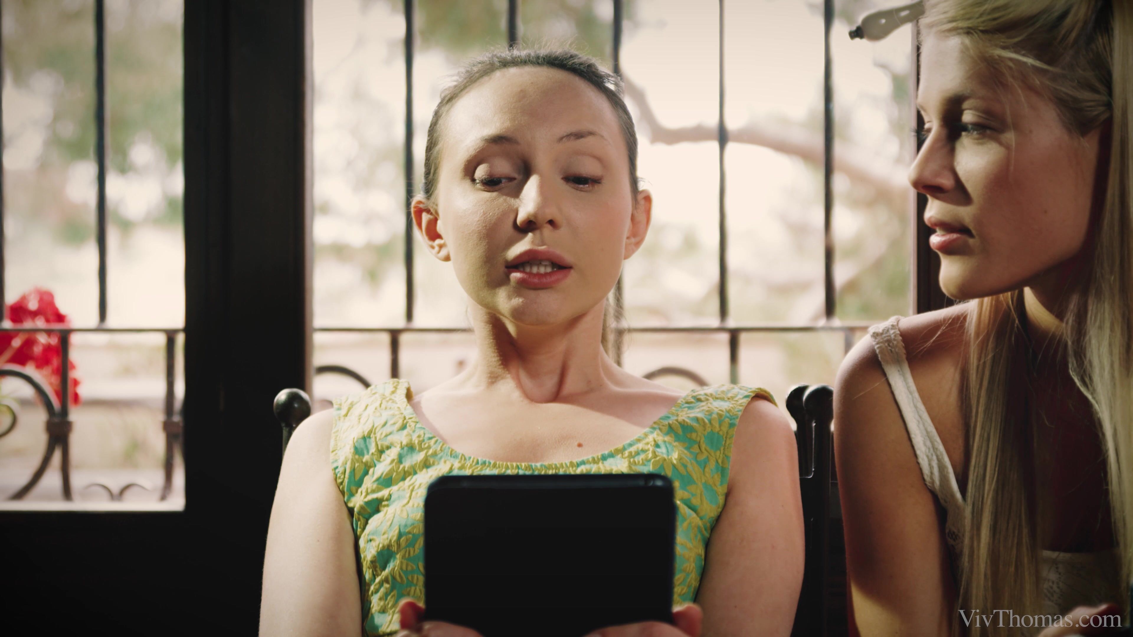 Gorgeous blonde Sweet Cat continues her wicked teasing in episode three of “Vox: Reloaded.” This time her willing victim is sexy Nataly Von, who attempts to read from an erotic novel as Sweet Cat torments her with a vibrating wand. Nataly squirms as the vibrations course through her body, Sweet Cat smiling naughtily and turning up the speed until her girlfriend can no longer continue reading as her orgasm sweeps through her. The girls kiss and caress each other through their pretty summer dresses, and Nataly slides a hand inside Sweet Cat’s panties to stroke her to a climax. They get naked, rubbing their beautiful slender bodies together, and Sweet Cat spreads Nataly’s shaved pussy open and licks it hungrily in doggy position. The slender brunette comes hard with Sweet Cat’s fingers stroking her clit and thrusting into her wet pussy. Sweet Cat lies back for Nataly to eat and finger her to another intense orgasm, then moves into spoons to reciprocate.