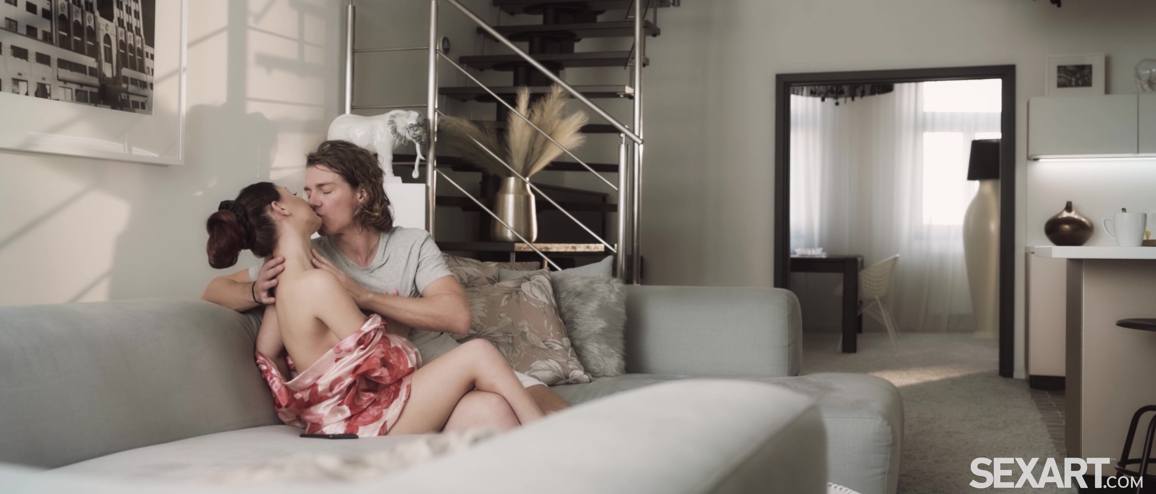 The day gets off to a sexy start for gorgeous brunette Jessie Clark and her boyfriend, Ricky. As Andrej Lupin’s erotic movie “Love Haze” begins, the lovers make sizzling eye contact across the room, and Jessie opens her silk robe to display more of her ample cleavage. Ricky makes it clear he’s enjoying the show as his sweetheart starts to caress her beautiful breasts. He joins her on the sofa, kissing and caressing her tenderly while she strokes the stiff dick that’s tenting his shorts. Ricky lavishes attention on Jessie’s breasts, then licks her pussy, giving her a powerful orgasm. They hurry to get naked, and Ricky thrusts into Jessie, first in missionary and then in spoons, their bodies slamming together as he fucks her vigorously. Jessie climaxes again before sucking her wetness from Ricky’s rigid cock, her sensual blowjob making him gasp with arousal. She skewers herself on his erection in reverse cowgirl, her cute ass bouncing and her breasts jiggling wildly as she rides to another orgasm, then jerks out his hot cum as they kiss adoringly.