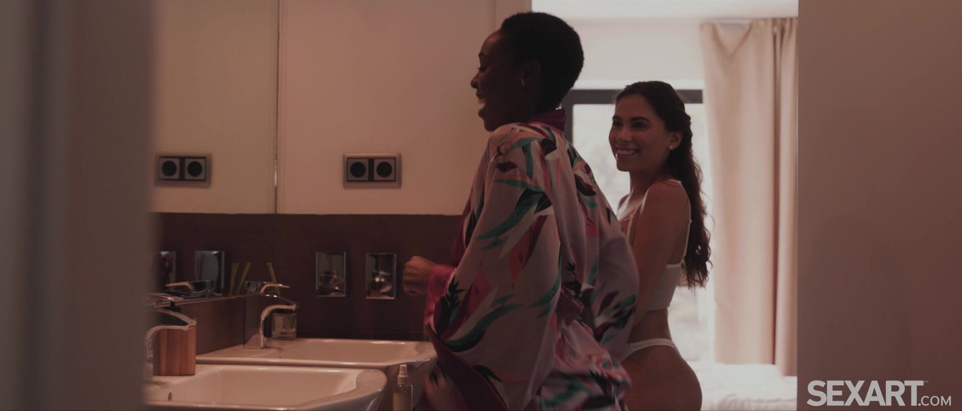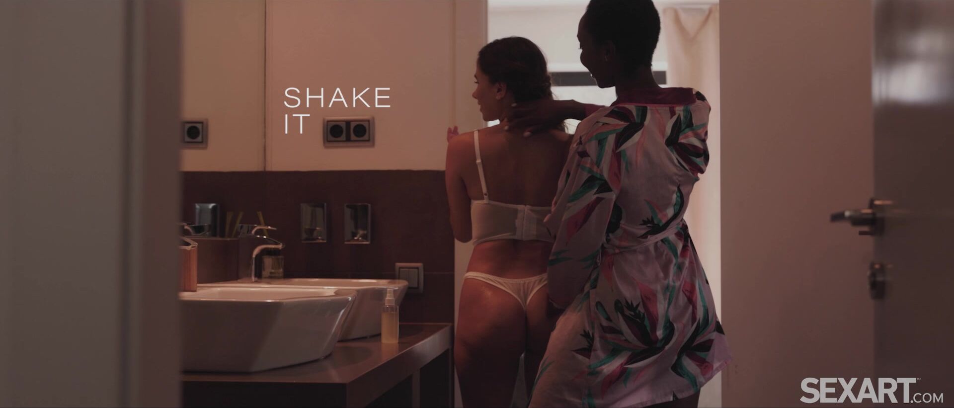 Cute girlfriends Baby Nicols and Zaawaadi are in the bathroom, fooling around as they apply body lotion to each other’s silky skin, at the start of Andrej Lupin’s hot lesbian movie “Shake It.” Zaawaadi twerks her sexy ass suggestively as Baby massages lotion into her firm cheeks, making them gleam alluringly. The Hispanic honey wants to learn how to shake her ass too, but Zaawaadi is too distracted by her pretty lips, kissing her as their embrace grows heated. Moving to the bed, they undress each other, hands and lips exploring eagerly. Zaawaadi slides a hand between her sweetheart’s thighs to stroke her, then kisses a trail from her stiff nipples to her pussy. She lavishes slow, sensuous licks on Baby’s clit, easing a couple of fingers into her tight slot to send her arousal into overdrive. Baby’s beautiful breasts jiggle enticingly as she trembles through an intense orgasm. After a second, even more powerful climax, Baby is eager for a taste of Zaawaadi’s hot pussy, nuzzling her fluffy bush as she eats her, then fingerbanging her to an orgasm and hugging her through the afterglow.