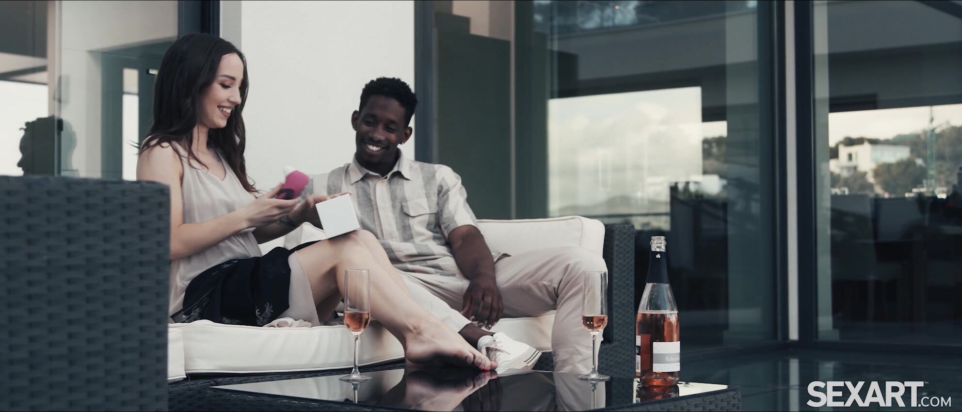 Cute brunette Kate Quinn enjoys a romantic date with Jesus Reyes that turns unexpectedly wild. As Andrej Lupin’s erotic movie “I Love You Baby” begins, he surprises her with the perfect gift – a fancy vibrator. She’s eager to try it, pulling up her dress and stroking it against her bare pussy, the intense sensations making her gasp. Kate straddles Jesus in a sixty-nine, freeing his big cock from his pants and sucking it eagerly as he teases her pussy with the vibrator. Quivering and moaning around her man’s erection, Kate’s petite body is wracked by waves of bliss. She turns around to mount him in cowgirl, sliding up and down on his dick, her sexy ass rippling as she orgasms again and again. Switching to reverse cowgirl, Kate buzzes the vibrator against her clit, going wild as the stimulation becomes overwhelming. They move into spoons so Jesus can thrust faster, stretching Kate’s slick pussy as she convulses with pleasure and filling her with his creamy cum.