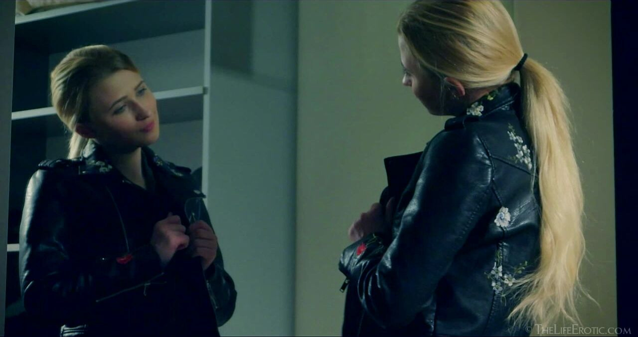 Lisa is a gorgeous, blue-eyed babe from Ukraine with a slim, perfect body and waist-length blonde hair worn in a ponytail. Arriving home, she admires herself in a full-length wall mirror. She’s dressed in a flower-embellished dark blue leather jacket, matching leather pants and an army-green blouse. After removing her jacket, she strips off the blouse to expose pert and braless medium sized breasts. She continues to strip, showing off her incredible ass and thighs in the tight pants before peeling them down to reveal large, plain white underwear. She pauses to admire herself, playfully pulling her panties tight into her crack and slit. Then she gets naked, raising them to her nose to smell her own arousal as she flaunts her shaved pussy. She swipes the panties along her slit, mopping up even more juices, then trails her hand down her naked body, homing in on her pussy almost immediately. She sinks down to sit on the floor, watching herself in the mirror as she sniffs and licks her panty-crotch, with her other hand strumming her clit hard and fast. Her legs are splayed and her toes pointed as she moans out loud, then she rubs the panties over her slit again, this time for extra friction. As her pleasure increases, she sinks down to lie on the floor, squirming, and stuffs the underwear into her mouth as a gag, attempting – with little success – to muffle her moans. One hand is now caressing her pussy as the other fingers her asshole. Finally, she sits facing the mirror so she can watch as she frigs her clit and pussy, finally reaching a frenzied climax. As she cums she slumps on her back, gasping for breath, and clutches her panties to her face. Then she lounges, feet up against the mirror, blissfully admiring her cute pink pussy as she drifts off to sleep.