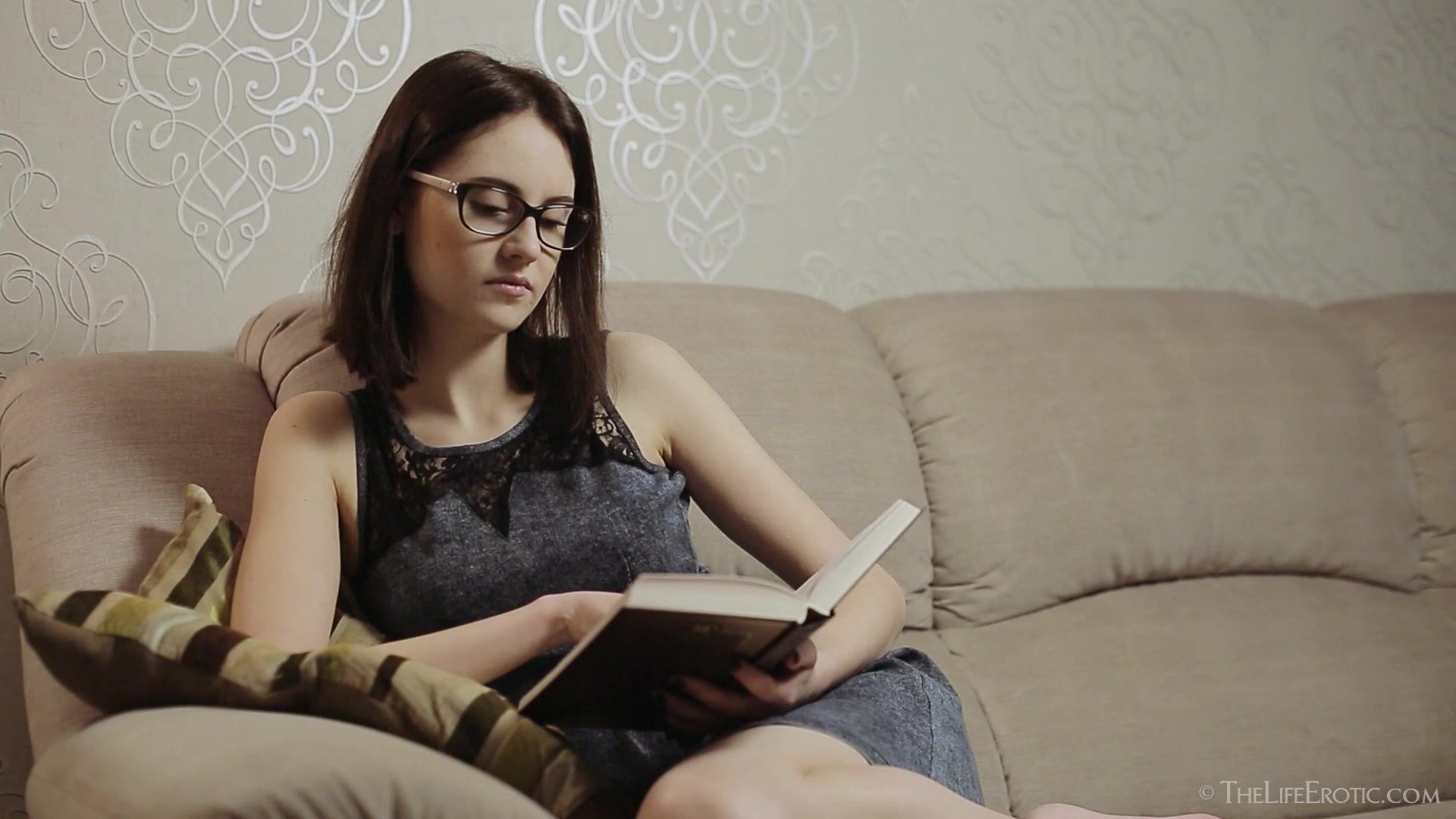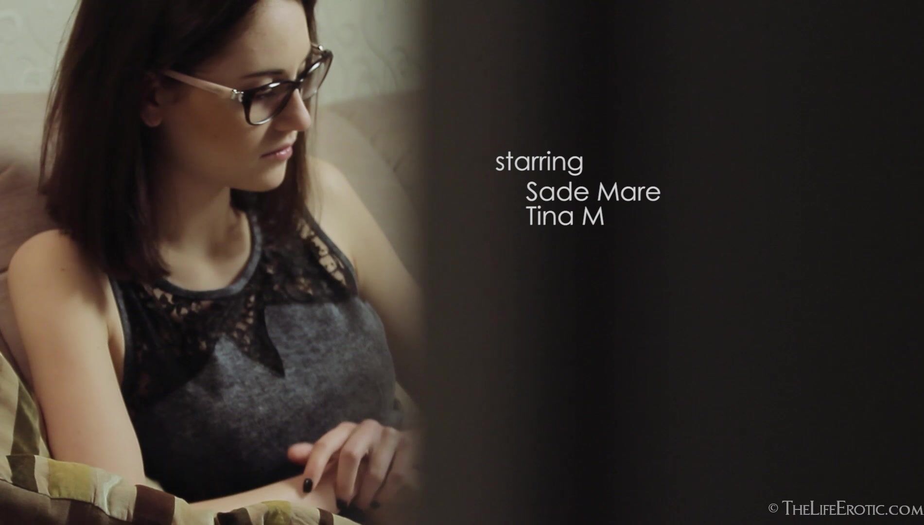 Sade Mare – a cute brunette with glasses – is relaxing on her couch, reading a book. Tina M – subtly vampish with her long black bob and one-shouldered little black dress – walks by the room and catches sight of her, through the half-open door. Soon, Tina is spying on her roomie, the lust and affection she feels for Sade written all over her face. As Sade reads, she moves her fingers lightly and absent-mindedly over the fabric of her dress… and the skin it leaves bare. Eventually, she closes the book – and opens her legs so she can caress her pussy through her panties. Outside, Tina watches, then strokes her own beautiful body. As Sade slips off the panties and begins to frig her pussy, Tina follows suit then ups the ante, unzipping her dress to reveal beautiful, pert breasts, then getting completely naked. Sade, still seemingly unaware she's being watched, removes her own dress and bra, exposing her large, stiff nipples. As she begins to masturbate, Sade’s own self-pleasure becomes more frenzied. The camera switches between each girl, capturing close-ups of their fingers getting busy and their ecstatic expressions, sountracked by their moans. When both cum, Tina seems to take as much pleasure in her friend’s climax as her own. As Tina grabs her clothes and heels and slips quietly away, Sade is left to enjoy the afterglow of her climax, apparently unaware that she was being watched.