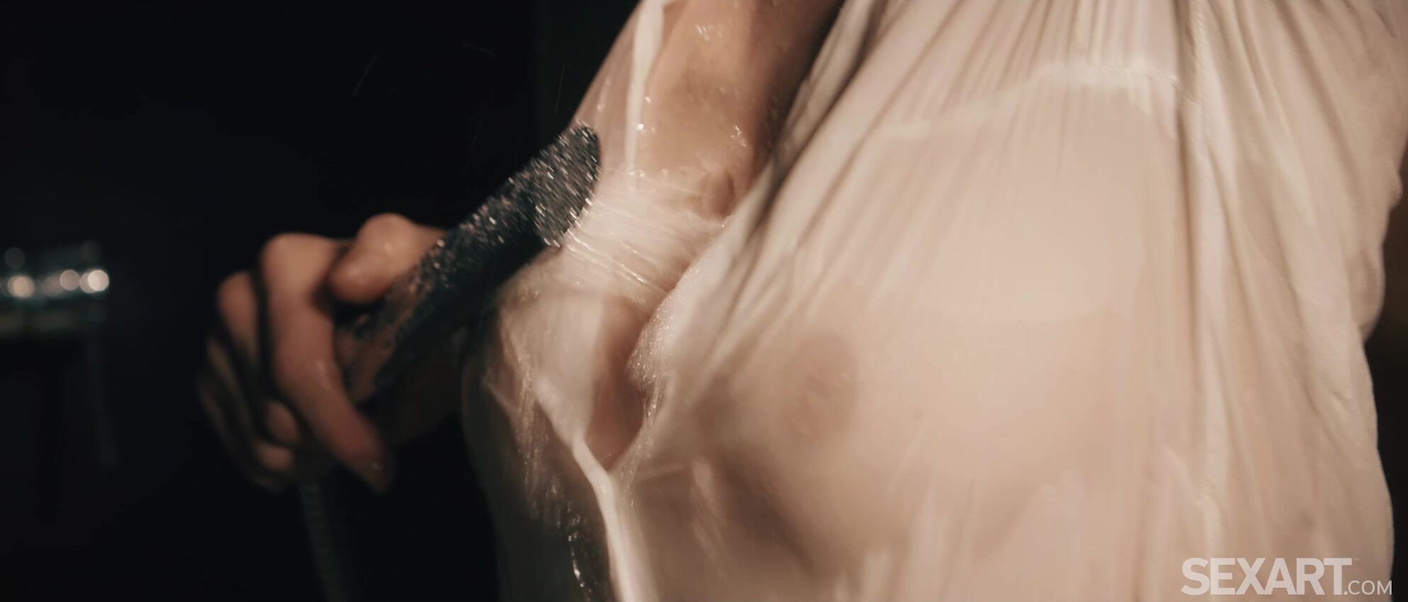 Cute brunette Nessie Blue is checking her reflection in the bathroom mirror, while Maxmilian Dior takes a shower. As Andrej Lupin’s erotic movie “Flow With You” begins, Nessie watches her man hungrily, then joins him in the shower, wrapping her arms around his wet body. Her white shirt clings to her beautiful breasts, turning transparent as it gets soaked. Max holds her tight and rubs her pussy through her drenched panties, making her tremble and gasp. He lifts her onto the counter and eats her pussy to a powerful orgasm, then thrusts his rigid cock inside her. Legs wrapped around her man’s waist, Nessie clings to him as he fucks her vigorously, sliding her up and down on his thick pole. They switch to a standing doggy, Max slamming into Nessie from behind, making her climax again and again. He keeps right on thrusting until she jerks his hot cum out all over her sexy ass. Now they both need another shower…