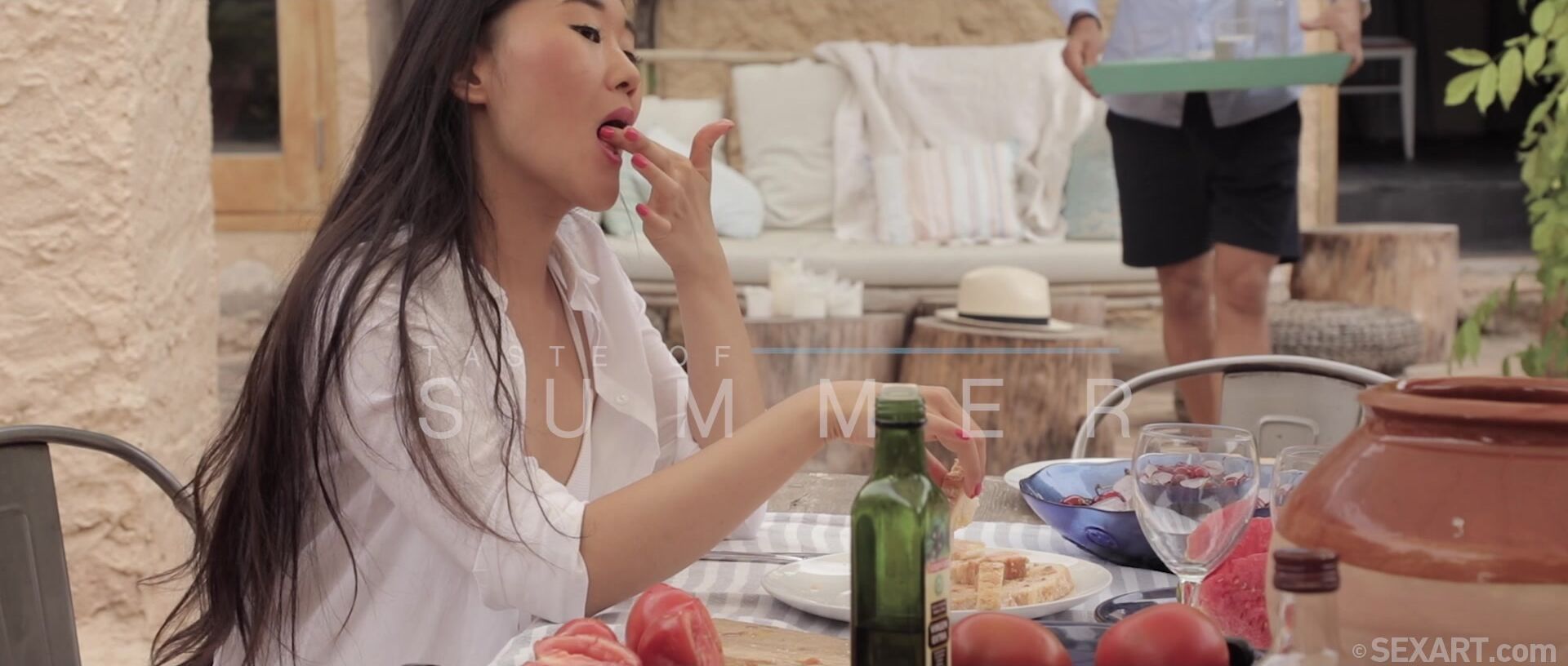 Cute Katana is out on the patio in her bikini, preparing a snack, as Anna Richards’ erotic movie “Taste Of Summer” begins. The Asian beauty is joined by Spanish stud Juan Lucho, who feeds her cherries and kisses the juice from her lips. Katana drops to her knees, freeing Juan’s stiffening cock from his shorts and taking it in her mouth, gazing up at him adoringly as she sucks and strokes it until it’s rigid. Juan pulls down his sweetheart’s bikini panties and bends her over the table, thrusting into her from behind to make her moan with arousal. He fucks her slow and steady, making her squeal with pleasure with each vigorous pump of his hips. Lifting Katana onto the table, Juan eats her shaved pussy to drive her to fever pitch, then penetrates her again in missionary. He drives her to an intense orgasm, and then a second as he fills her with his hot load.