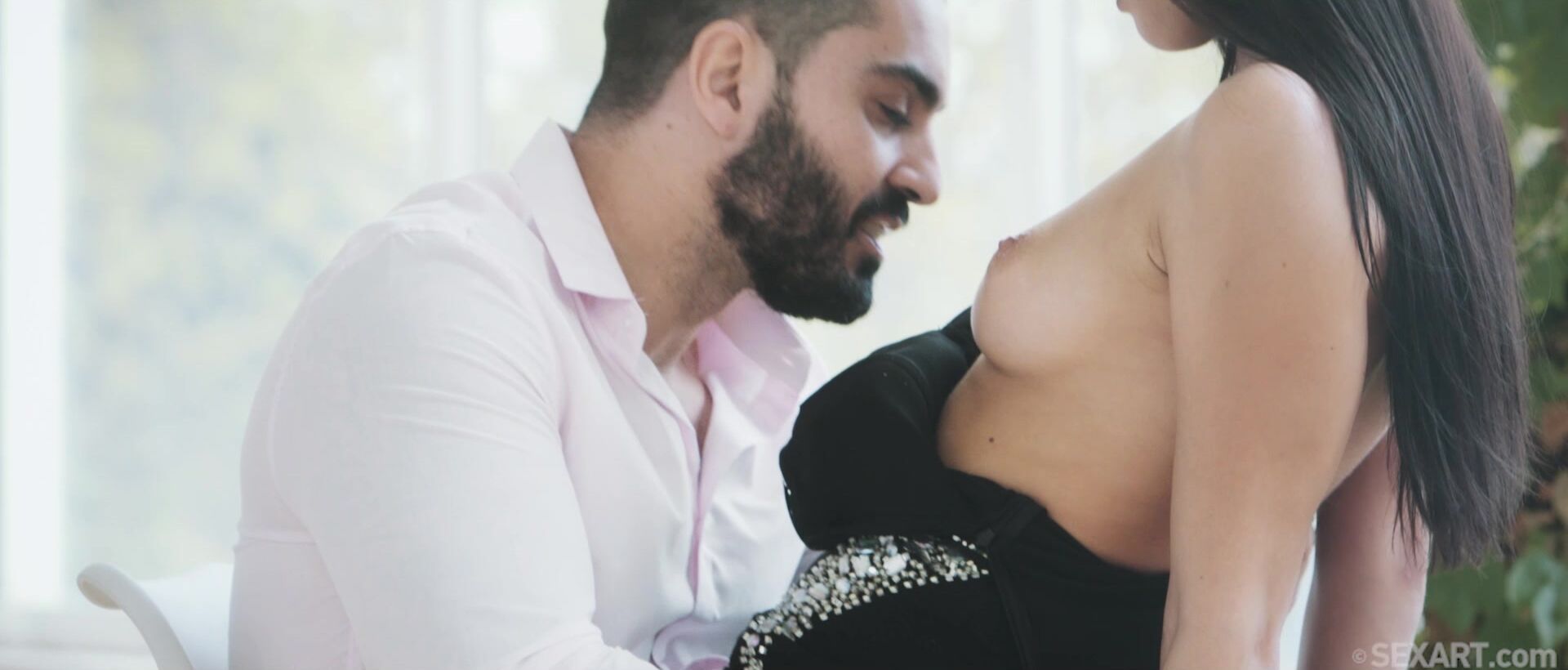 Stunning brunette Katy Rose moves gracefully as Andrej Lupin’s erotic movie “Shall We Dance” begins, her legs looking sensational in sexy heels and a dress split to her thigh. Miguel Zayos watches her from the balcony, then joins her for a dance that conveys all their mutual lust without words. Katy pushes Miguel into a seat, straddling him so he can stroke her pussy through her panties. He pulls down her dress to lavish attention on her beautiful breasts as she grinds in his lap, turning her on until she kneels to free his thick cock from his pants. Wrapping her fingers and lips around it, Katy bobs her head to suck him deeper with each stroke. She sits astride him again in cowgirl, sinking down on his dick and riding energetically, moaning as pleasure courses through her gorgeous body. Pausing to strip to her heels, Katy impales herself in reverse cowgirl, her tight pussy gripping Miguel’s cock as she slides up and down frenetically. She wants it from behind, bracing herself against the window as Miguel thrusts into her rapidly. He fucks her to a noisy orgasm, filling her with a hot cum load that drips out as they embrace.