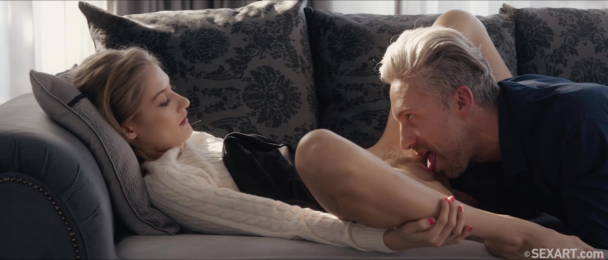 Cute blonde Tiffany Tatum relaxes on the sofa after a long day. As Andrej Lupin’s erotic movie “Evermore” begins, Lutro brings her a glass of wine and kisses her tenderly, making her smile. He massages her shoulders and her pretty feet, sucking and nibbling her toes. His hands travel up her long silky legs to unsnap the crotch of her white bodysuit, and she pins her knees back to open herself up as he buries his nose in her fluffy bush and licks her from ass to clit, driving her wild. So turned on, Tiffany rushes to free her man’s cock from his pants and climbs aboard, straddling him in cowgirl and guiding his erection into her drenched pussy. She bounces her perfect ass up and down energetically, feeding her nipples into his mouth as she rides. Lutro flips her onto her back so he can fuck her harder, gazing into her eyes as he thrusts steadily. They pause for Tiffany to suck her flavor from his thick shaft, before she moves astride him again. She slides up and down on his dick until they climax together, his cum gushing out as she dismounts, giggling.
