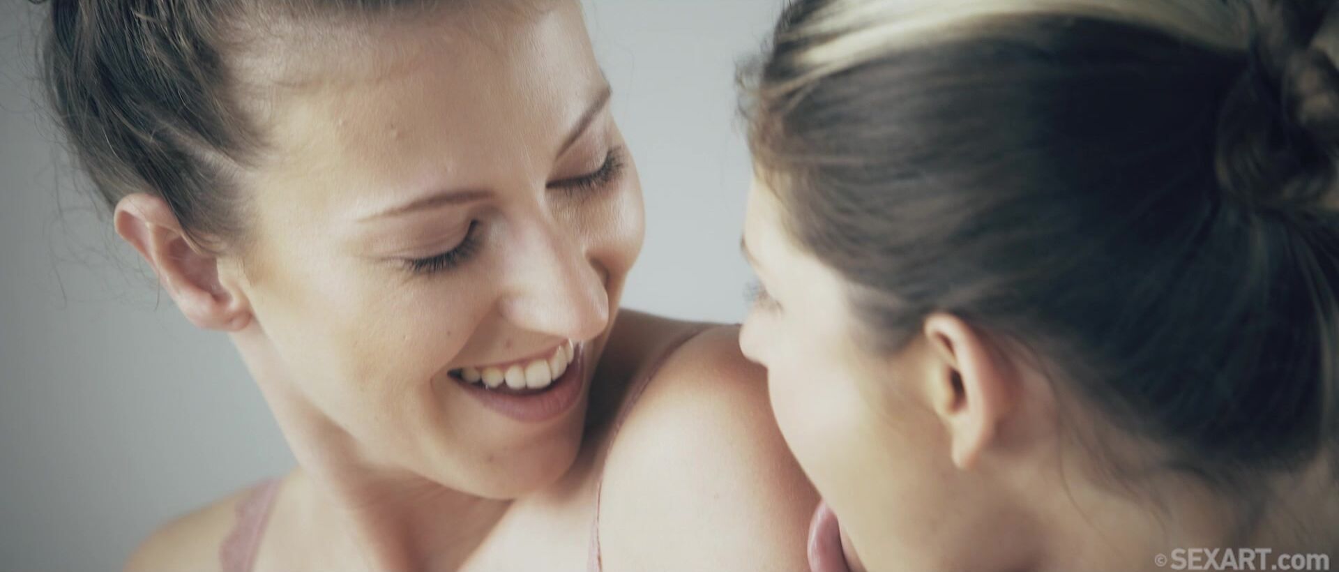 Gorgeous Gina Gerson licks and kisses busty Emylia Argan’s neck and shoulders with unrestrained passion, as Andrej Lupin’s erotic movie “Assimilation” begins. Emylia is perched on the edge of the bed with her legs spread and Gina kneeling behind her. Gina is wild, tugging down Emylia’s camisole with her teeth so her huge natural breasts tumble out, squeezing them avidly and reaching around to stroke her pussy through her panties. It’s a delicious contrast when Emylia peels off Gina’s lingerie to expose her sexy small breasts, lapping at her stiff nipples until she’s squirming with excitement, then sucking and biting her pussy through her panties. She gets the slender cutie naked, and Gina lies back, shivering and moaning with arousal as her skilful lover licks her ultra-sensitive shaved slit. She grows even louder as Emylia thrusts two fingers into her tight pussy while tonguing her clit, making her petite body convulse with orgasmic sensations. Emylia is relentless, using both hands to drive Gina to peak after peak of pleasure. Pushing her onto her back, Emylia straddles Gina’s pretty face, grinding her unshaven pussy on her mouth. Gina reaches up to fondle Emylia’s heavy tits as she eats her to a powerful orgasm. But she’s not done with her fuck buddy yet, and rolls her onto her front so she can finger-bang her juicy pussy from behind, until she climaxes again. It’s lesbian love at its most intensely lustful.