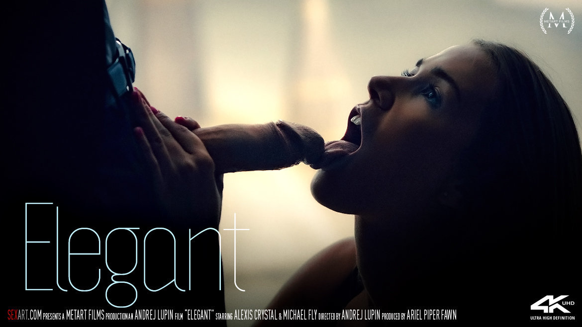 Seen only in tantalizing silhouette, beautiful Alexis Crystal pushes Michael Fly against the wall to kiss him hungrily, as Andrej Lupin’s atmospheric erotic movie “Elegant” begins. She unzips his pants to let his long cock spring free, then sucks his fingers and guides them into her panties to stroke her pussy. Leading him by his cock into the light, Alexis kneels to suck and jerk it avidly, perfect ass in the air as she swallows the huge shaft right down to the root. She tugs down her bra to let him suck on her stiff nipples, peels off her panties and guides his erection into her tight pussy, sinking down on him in reverse cowgirl. Her sexy body undulates as she rocks and grinds, rubbing her clit feverishly, intensifying the powerful sensations coursing through her. Spinning around into cowgirl, she impales herself on his huge dick again, then turns back to drive him wild with the view of her ass rising and falling hypnotically in his lap. Michael takes a long lick at her succulent shaved pussy and asshole, before thrusting back into her in doggy. He fucks her to an explosive climax and fills her with his hot load, a superbly athletic couple in stunning sexual harmony.