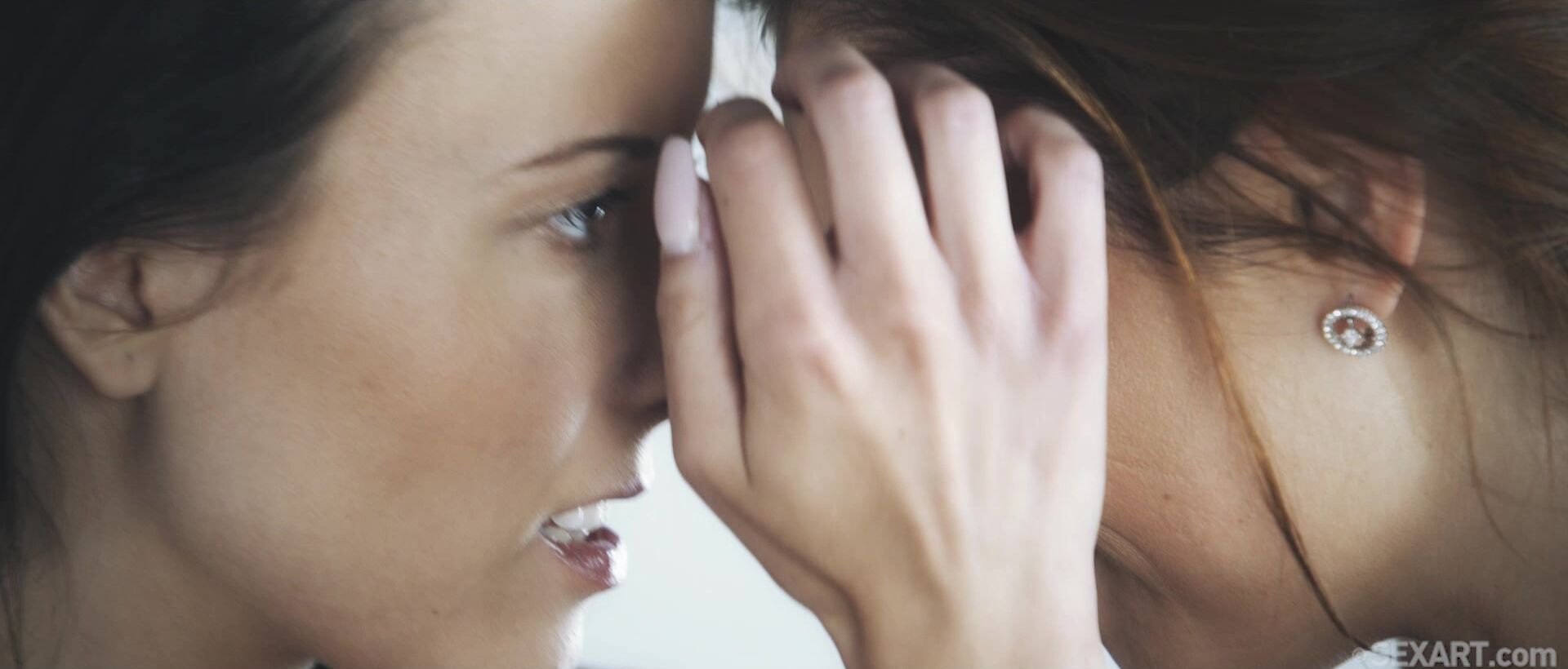 Cute office worker Lexi Layo daydreams about having a sexual encounter with her gorgeous colleague Sabrisse A, as Andrej Lupin’s fantasy-fuelled “Hotline 1” begins. Lexi’s mind wanders from the call center where they are sitting side by side, and she pictures them both dressed in nothing but lacy lingerie, kissing passionately. Soon slender Sabrisse is naked, and Lexi is fondling her small, pert breasts and stroking her pussy. Sabrisse sits astride Lexi, gasping with arousal as she rides her fingers to a quiet but intense orgasm. Lexi sucks the sticky sex juice from her fingers as her fuck buddy yanks off her lingerie, pushes her onto her back and straddles her pretty face. Sabrisse grinds on Lexi’s probing tongue and flickering fingers until she’s climaxing again. Now Sabrisse wants to touch Lexi, pulling her sweetheart onto her lap in cowgirl and cramming her fingers between Lexi’s dark pussy lips and into her wet slit. Lexi rocks her hips, frigging Sabrisse just as frantically, shaking as she’s overwhelmed by a powerful orgasm. Back in reality, Lexi is visibly aroused, and has to take time out from her work…