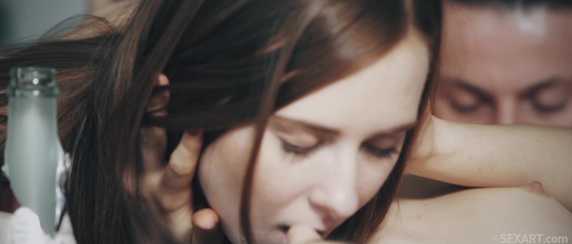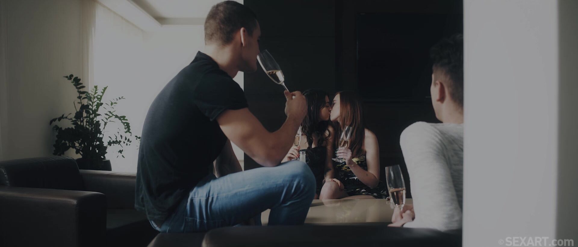 Sexy redhead Linda Sweet kisses her brunette girlfriend Tera Link while the guys watch avidly, as episode four of Andrej Lupin’s sensational erotic series “Free House” begins. Maxmilian Dior is house sitting when his buddy Nick Ross shows up with the girls and some bottles of bubbly, ready to party. Soon the horny sweethearts are tangling tongues and fondling each other’s breasts, enjoying the thrill of putting on a show for their enthusiastic audience. The men watch as Tera lies back on the coffee table so Linda can peel off her pantyhose and lick her shaved pussy. While Linda’s tongue flicks between her pussy lips, Maxmilian sucks Tera’s stiff nipples, and Nick gets in on the action, fingering Linda from behind. Once Tera is naked, Nick takes over eating and fingering her pussy. When he breaks off to kiss Linda, Tera crawls across the table to Maxmilian, unzips his jeans and pulls out his hard cock. She licks and sucks it deep, looking up at him adoringly, while Linda jerks and sucks Nick’s dick energetically, and Nick reaches across to stroke Tera’s pussy. The girls switch partners, Nick plowing into Tera in missionary while Linda rides the seated Maxmilian in reverse cowgirl, her clit piercing gleaming beneath her natural red bush. She leans forward to kiss Tera as they both get fucked hard. The sound of flesh slapping on flesh as cocks drive into pussies increases in volume when they form a naked fuck train, with Maxmilian standing screwing Linda from behind, while Tera caresses her perfect breasts and frigs her clit, and Nick doggy bangs Tera. Switching partners again, Tera rides Maxmilian in a standing reverse cowgirl while Linda hooks her leg over Nick’s shoulder as he humps her. Tera’s orgasm is intense, making her shudder uncontrollably, and Linda gasps and moans through her climax, tits jiggling with each thrust of Nick’s cock. Tera kneels to suck and jerk Maxmilian’s over her breasts as Nick spurts a hot load over Linda’s belly. The guys are spent, but the look the girls give each other suggests they might not be finished just yet…