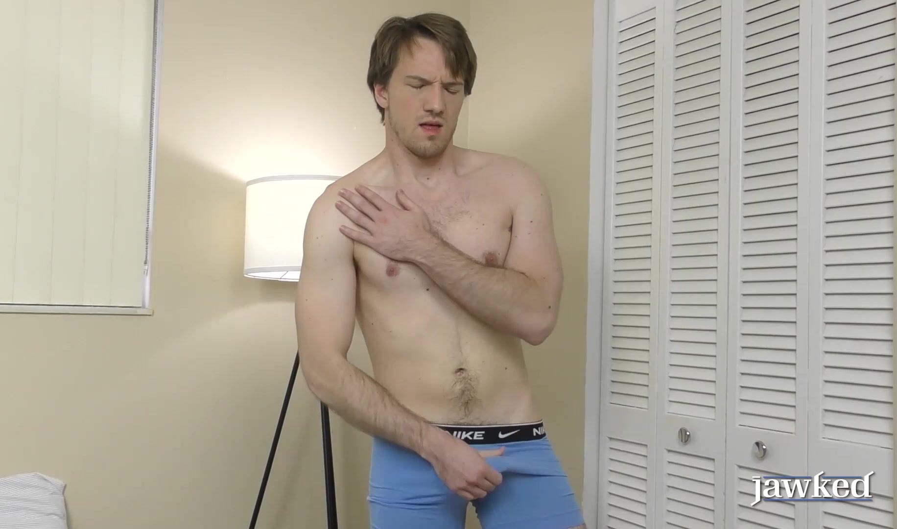 Being such a fit and sporty guy new Jawked arrival Xavier Oceane is always horny and constantly has a need to get a load out. We're happy to be enjoying it with him for this debut solo with the sexy guy and his demanding cock. He's focused on one thing, pleasing his dick. With a little groping of his swollen member in his sexy shorts he encourages us all to join in, slipping off his t-shirt to display his treasure trail and his manly pits. The tease continues when the shorts come down to reveal boxer briefs, with more bulge groping leading to the reveal of his hairy ass. Xavier is the kind of manly guy we love to see, not the kind of jock to shave himself smooth. And we sure appreciate it when he lays back on the bed with his bushy pubes on show while he jacks his cock and builds up to a creamy finish. The horny dude displays his swollen pole, a curved length of pleasure that he loves to show off. We don't know what he's thinking about while he closes his eyes and masturbated with a determined rhythm, but whatever it is it sure does the trick to help him splash out a big messy cum load that squirts up to his flexing bicep. A little lick of the good stuff makes for the perfect finish, and has us looking forward to seeing him back again.