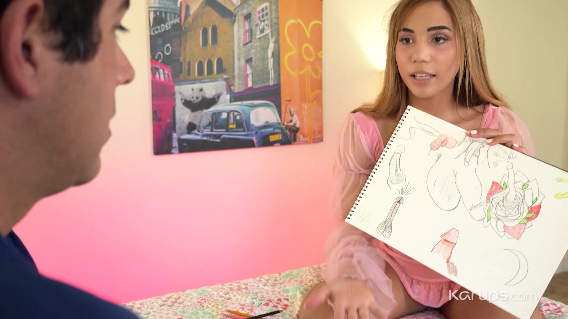 Alita Lee is an artist who needed a model. Her sister was busy, so she asked her sister’s boyfriend to be the model. He turned her down at first, but then gave into the cute redhead and posed while she sketched. Setting the drawing aside, she made her move, leaning in and kissing him. Knowing they had to move fast to avoid being caught, he got naked and laid back on her bed so the cute college girl could suck his cock and get him rock hard. He returned the oral favor, getting her shaved pussy nice and wet then driving his hard cock deep inside her. She may think love is for suckers, but she loves to fuck! He fucked her all over the bed, hitting it from behind and letting her bounce on top like a cowgirl. He fucked her hard then pulled out and showered her tight body and small tits with his cum, leaving her to lick his cock clean!