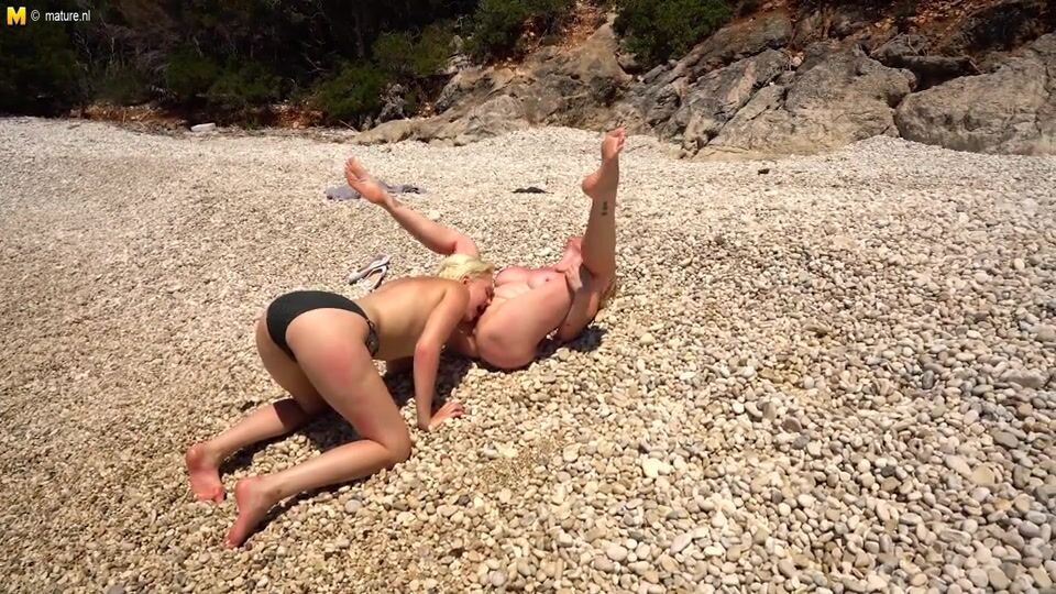 Horny British Milf and her young girlfriend enjoy each other's pussies on the beach