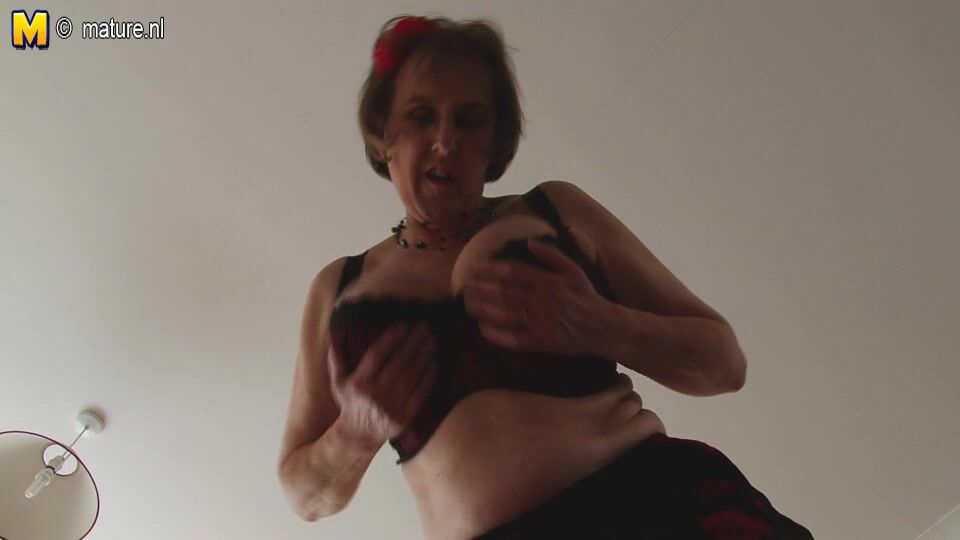 Horny British mature woman playing with her unshaved pussy and her round natural tits
