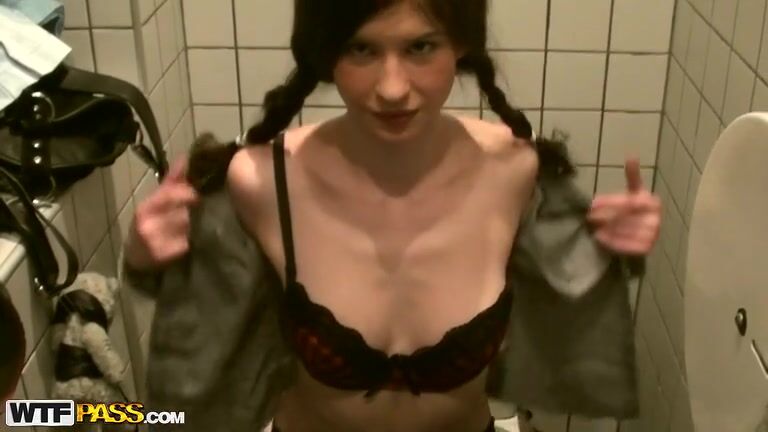 The sexy babe showed a real deep throat to two pick-up artists who, instead of going to the hotel, decided to put two barrels on her in the toilet.