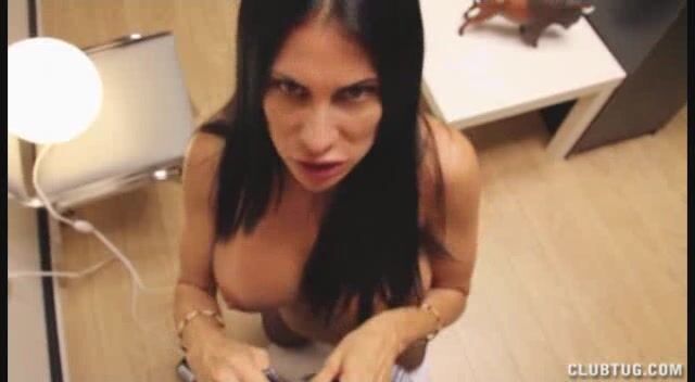 Busty babe Sheila Marie is hold up in her bosses office when he comes in wanting some stress relief the horny mom pulls out her whopping tits and starts to titty fuck his thick dick. She jerks him and tit fucks his cock until her explodes on her face.